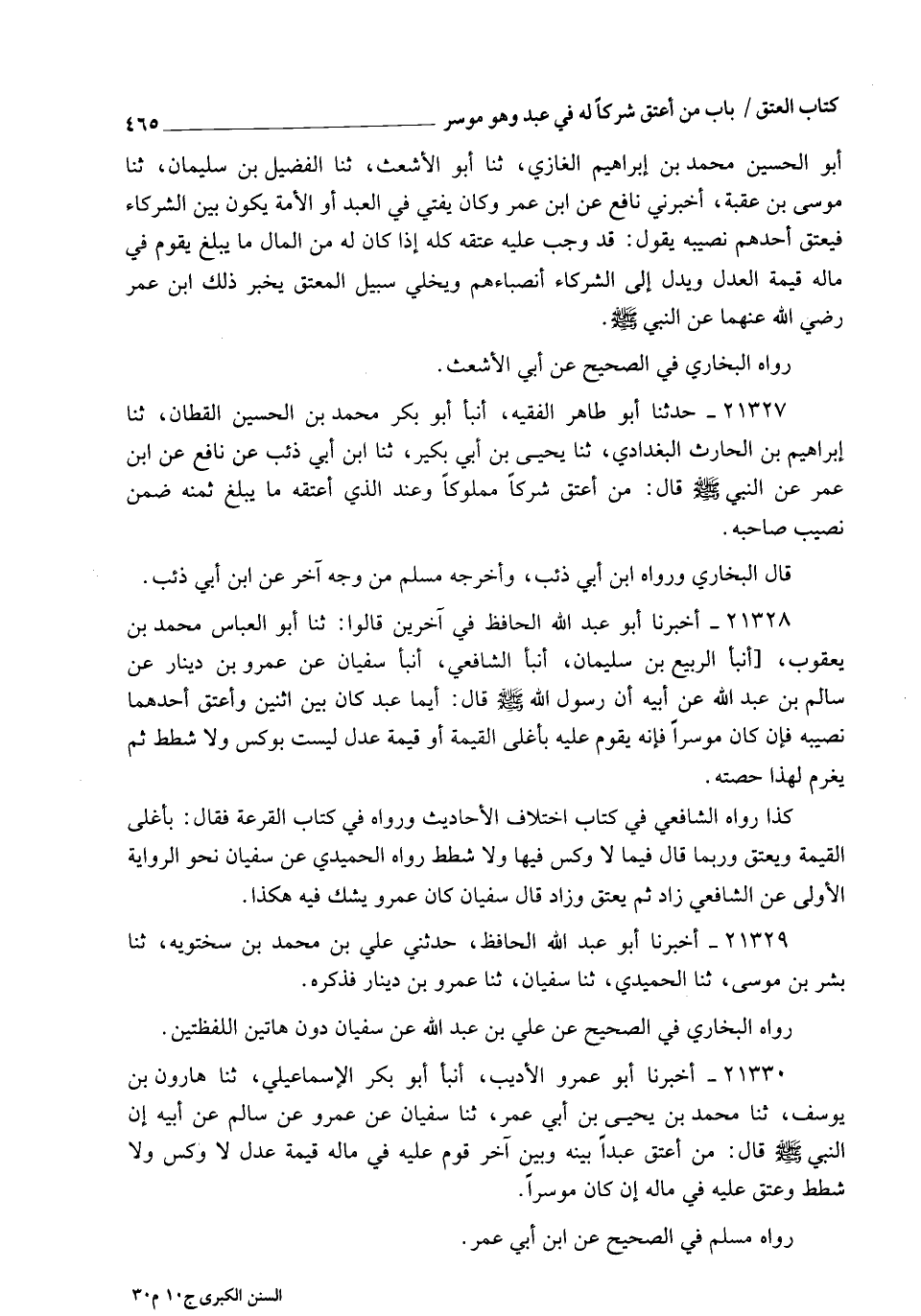 21327 - حَدَّثَنَا أَبُو طَاهِرٍ الْفَقِيهُ , أنبأ أَبُو بَكْرٍ مُحَمَّدُ بْنُ الْحُسَيْنِ الْقَطَّانُ , ثنا إِبْرَاهِيمُ بْنُ الْحَارِثِ الْبَغْدَادِيُّ , ثنا يَحْيَى بْنُ أَبِي بُكَيْرٍ , ثنا ابْنُ أَبِي ذِئْبٍ , عَنْ نَافِعٍ , عَنِ ابْنِ عُمَرَ , عَنِ النَّبِيِّ صَلَّى اللهُ عَلَيْهِ وَسَلَّمَ قَالَ: §" مَنْ أَعْتَقَ شِرْكًا مَمْلُوكًا وَعِنْدَ الَّذِي أَعْتَقَهُ مَا يَبْلُغُ ثَمَنَهُ ضَمِنَ نَصِيبَ صَاحِبِهِ " قَالَ الْبُخَارِيُّ: وَرَوَاهُ ابْنُ أَبِي ذِئْبٍ , وَأَخْرَجَهُ مُسْلِمٌ مِنْ وَجْهٍ آخَرَ عَنِ ابْنِ أَبِي ذِئْبٍ