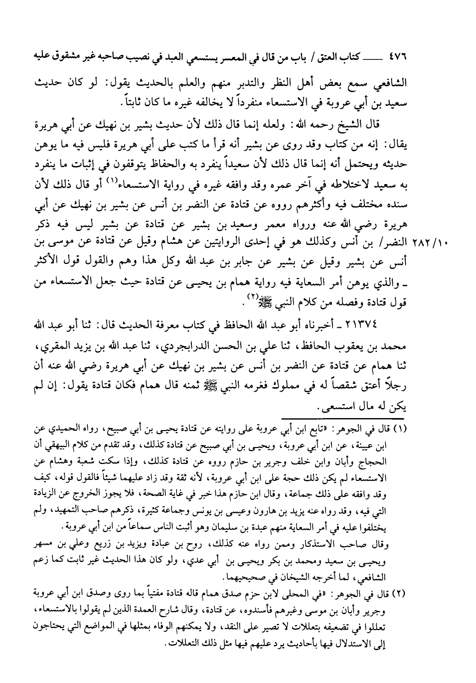 21374 - أَخْبَرَنَاهُ أَبُو عَبْدِ اللهِ الْحَافِظُ، فِي كِتَابِ مَعْرِفَةِ الْحَدِيثِ , قَالَ: ثنا أَبُو عَبْدِ اللهِ مُحَمَّدُ بْنُ يَعْقُوبَ الْحَافِظُ , ثنا عَلِيُّ بْنُ الْحَسَنِ الدَّارَابَجِرْدِيُّ , ثنا عَبْدُ اللهِ بْنُ يَزِيدَ الْمُقْرِئُ , ثنا هَمَّامٌ، عَنْ قَتَادَةَ، عَنِ النَّضْرِ بْنِ أَنَسٍ، عَنْ بَشِيرِ بْنِ نَهِيكٍ، عَنْ أَبِي هُرَيْرَةَ رَضِيَ اللهُ عَنْهُ §أَنَّ رَجُلًا أَعْتَقَ شِقْصًا لَهُ فِي مَمْلُوكٍ , فَغَرَّمَهُ النَّبِيُّ صَلَّى اللهُ عَلَيْهِ وَسَلَّمَ ثَمَنَهُ. قَالَ هَمَّامٌ: فَكَانَ قَتَادَةُ يَقُولُ: إِنْ لَمْ يَكُنْ لَهُ مَالٌ اسْتَسْعَى