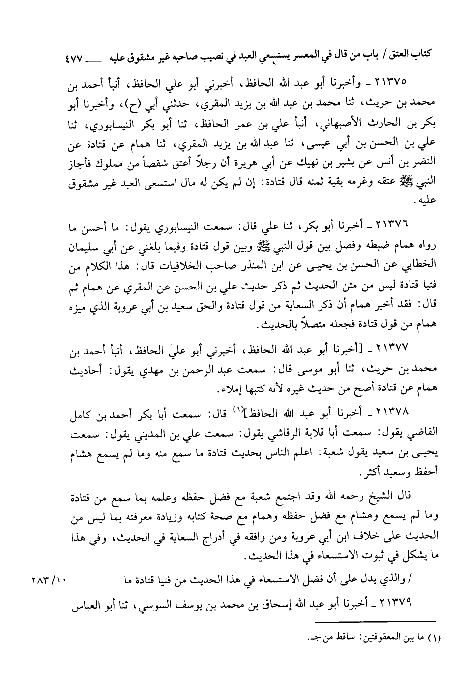 21375 - وَأَخْبَرَنَا أَبُو عَبْدِ اللهِ الْحَافِظُ , أَخْبَرَنِي أَبُو عَلِيٍّ الْحَافِظُ , أنبأ أَحْمَدُ بْنُ مُحَمَّدِ بْنِ حُرَيْثٍ , ثنا مُحَمَّدُ بْنُ عَبْدِ اللهِ بْنِ يَزِيدَ الْمُقْرِئُ , حَدَّثَنِي أَبِي ح وَأَخْبَرَنَا أَبُو بَكْرِ بْنُ الْحَارِثِ الْأَصْبَهَانِيُّ , أنبأ عَلِيُّ بْنُ عُمَرَ الْحَافِظُ , ثنا أَبُو بَكْرٍ النَّيْسَابُورِيُّ , ثنا عَلِيُّ بْنُ الْحَسَنِ بْنِ أَبِي عِيسَى , ثنا عَبْدُ اللهِ بْنُ يَزِيدَ الْمُقْرِئُ , ثنا هَمَّامٌ , عَنْ قَتَادَةَ , عَنِ النَّضْرِ بْنِ أَنَسٍ , عَنْ بَشِيرِ بْنِ نَهِيكٍ , عَنْ أَبِي هُرَيْرَةَ، أَنَّ رَجُلًا أَعْتَقَ شِقْصًا مِنْ مَمْلُوكٍ , §فَأَجَازَ النَّبِيُّ صَلَّى اللهُ عَلَيْهِ وَسَلَّمَ عِتْقَهُ , وَغَرَّمَهُ بَقِيَّةَ ثَمَنِهِ. . قَالَ قَتَادَةُ: إِنْ لَمْ يَكُنْ لَهُ مَالٌ اسْتَسْعَى الْعَبْدُ غَيْرَ مَشْقُوقٍ عَلَيْهِ.
