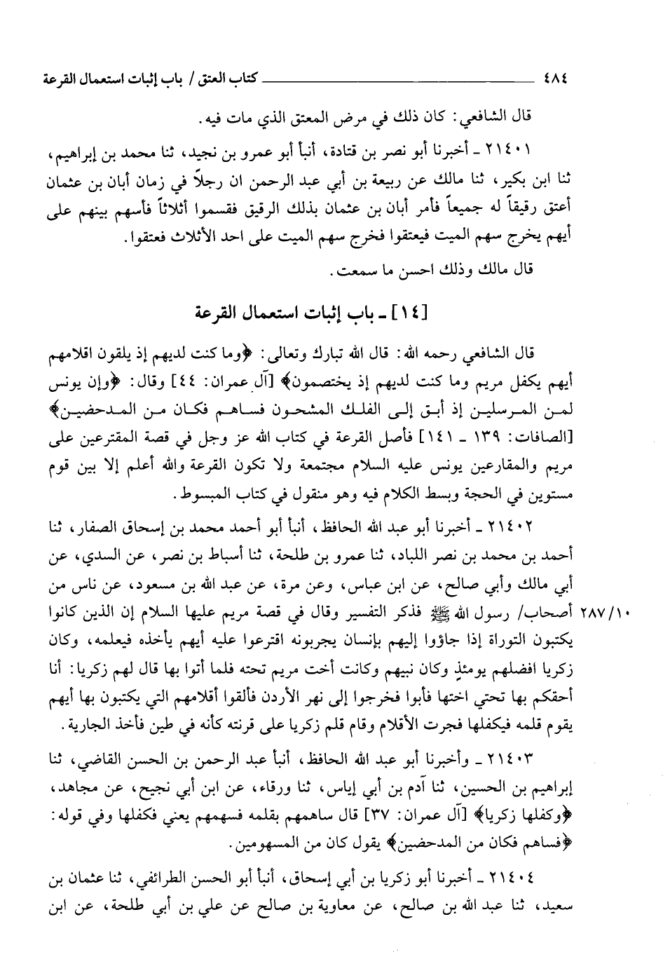 قَالَ الشَّافِعِيُّ رَحِمَهُ اللهُ: " قَالَ اللهُ تَبَارَكَ وَتَعَالَى: {وَمَا كُنْتَ لَدَيْهِمْ إِذْ يُلْقُونَ أَقْلَامَهُمْ أَيُّهُمْ يَكْفُلُ مَرْيَمَ وَمَا كُنْتَ لَدَيْهِمْ إِذْ يَخْتَصِمُونَ} [آل عمران: 44] وَقَالَ: {وَإِنَّ يُونُسَ لِمَنَ الْمُرْسَلِينَ إِذْ أَبَقَ إِلَى الْفُلْكِ الْمَشْحُونِ فَسَاهَمَ فَكَانَ مِنَ الْمُدْحَضِينَ} [الصافات: 140] فَأَصْلُ الْقُرْعَةِ فِي كِتَابِ اللهِ عَزَّ وَجَلَّ فِي قِصَّةِ الْمُقْتَرِعِينَ عَلَى مَرْيَمَ , وَالْمُقَارِعِينَ يُونُسَ عَلَيْهِ السَّلَامُ مُجْتَمِعَةٌ , وَلَا تَكُونُ الْقُرْعَةُ وَاللهُ أَعْلَمُ إِلَّا بَيْنَ قَوْمٍ مُسْتَوِينَ فِي الْحُجَّةِ. وَبَسَطَ الْكَلَامَ فِيهِ , وَهُوَ مَنْقُولٌ فِي كِتَابِ الْمَبْسُوطِ.