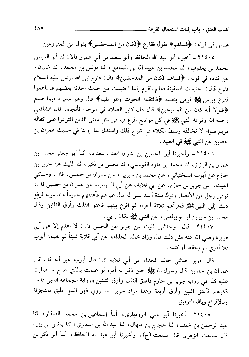 21406 - وَأَخْبَرَنَا أَبُو الْحُسَيْنِ بْنُ بِشْرَانَ الْعَدْلُ، بِبَغْدَادَ , أنبأ أَبُو جَعْفَرٍ مُحَمَّدُ بْنُ عَمْرِو بْنِ الرَّزَّازِ , ثنا مُحَمَّدُ بْنُ دَاوُدَ الْقُومِسِيُّ , ثنا يَحْيَى بْنُ بُكَيْرٍ , ثنا اللَّيْثُ , عَنْ جَرِيرِ بْنِ حَازِمٍ , عَنْ أَيُّوبَ السَّخْتِيَانِيِّ , عَنْ مُحَمَّدِ بْنِ سِيرِينَ , عَنْ عِمْرَانَ بْنِ حُصَيْنٍ، قَالَ: وَحَدَّثَنِي اللَّيْثُ , عَنْ جَرِيرِ بْنِ حَازِمٍ , عَنْ أَبِي قِلَابَةَ , عَنْ أَبِي الْمُهَلَّبِ , عَنْ عِمْرَانَ بْنِ حُصَيْنٍ، قَالَ: تُوُفِّيَ رَجُلٌ مِنَ الْأَنْصَارِ , وَتَرَكَ سِتَّةَ أَعْبُدٍ , لَيْسَ لَهُ مَالٌ غَيْرُهُمْ , فَأَعْتَقَهُمْ جَمِيعًا عِنْدَ مَوْتِهِ , فَرُفِعَ ذَلِكَ إِلَى النَّبِيِّ صَلَّى اللهُ عَلَيْهِ وَسَلَّمَ , §فَجَزَّأَهُمْ ثَلَاثَةَ أَجْزَاءٍ , ثُمَّ أَقْرَعَ بَيْنَهُمْ , فَأَعْتَقَ الثُّلُثَ , وَأَرَقَّ الثُّلُثَيْنِ. وَقَالَ مُحَمَّدُ بْنُ سِيرِينَ: لَوْ لَمْ يَبْلُغْنِي عَنِ النَّبِيِّ صَلَّى اللهُ عَلَيْهِ وَسَلَّمَ لَكَانَ رَأْيِيَ.