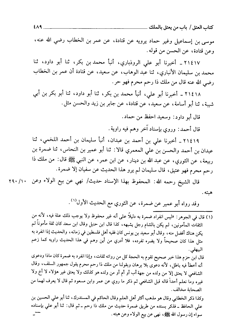 21419 - أَخْبَرَنَا عَلِيُّ بْنُ أَحْمَدَ بْنِ عَبْدَانَ , أنبأ سُلَيْمَانُ بْنُ أَحْمَدَ اللَّخْمِيُّ , ثنا عَبْدَانُ بْنُ أَحْمَدَ , وَالْحَسَنُ بْنُ عَلِيٍّ الْمَعْمَرِيُّ قَالَا: ثنا أَبُو عُمَيْرِ بْنُ النَّحَّاسِ , ثنا ضَمْرَةُ بْنُ رَبِيعَةَ , عَنِ الثَّوْرِيِّ , عَنْ عَبْدِ اللهِ بْنِ دِينَارٍ , عَنِ ابْنِ عُمَرَ عَنِ النَّبِيِّ صَلَّى اللهُ عَلَيْهِ وَسَلَّمَ قَالَ: §" مَنْ مَلَكَ ذَا رَحِمٍ مَحْرَمٍ فَهُوَ عَتِيقٌ ". قَالَ سُلَيْمَانُ: لَمْ يَرْوِ هَذَا الْحَدِيثَ عَنْ سُفْيَانَ إِلَّا ضَمْرَةُ. قَالَ الشَّيْخُ رَحِمَهُ اللهُ: " الْمَحْفُوظُ بِهَذَا الْإِسْنَادِ حَدِيثُ نَهْيٍ عَنْ بَيْعِ الْوَلَاءِ وَعَنْ هِبَتِهِ. وَقَدْ رَوَاهُ أَبُو عُمَيْرٍ، عَنْ ضَمُرَةَ، عَنِ الثَّوْرِيِّ مَعَ الْحَدِيثِ الْأَوَّلِ ". -[490]-