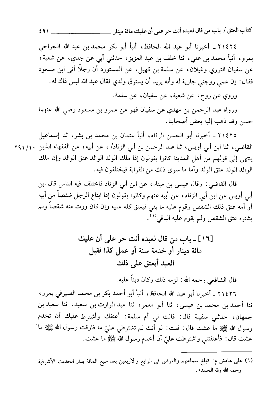 21425 - أَخْبَرَنَا أَبُو الْحَسَنِ الرَّفَّاءُ , أنبأ عُثْمَانُ بْنُ مُحَمَّدِ بْنِ بِشْرٍ , ثنا إِسْمَاعِيلُ الْقَاضِي , ثنا ابْنُ أَبِي أُوَيْسٍ , ثنا عَبْدُ الرَّحْمَنِ بْنُ أَبِي الزِّنَادِ , عَنْ أَبِيهِ , عَنِ الْفُقَهَاءِ الَّذِينَ يُنْتَهَى إِلَى قَوْلِهِمْ مِنْ أَهْلِ الْمَدِينَةِ , كَانُوا يَقُولُونَ: §" إِذَا مَلَكَ الْوَلَدُ الْوَالِدَ عَتَقَ الْوَالِدُ , وَإِنْ مَلَكَ الْوَالِدُ الْوَلَدَ عَتَقَ الْوَلَدُ ". وَأَمَّا مَا سِوَى ذَلِكَ مِنَ الْقَرَابَةِ فَيَخْتَلِفُونَ فِيهِ. قَالَ الْقَاضِي: وَقَالَ عِيسَى بْنُ مِينَاءٍ، عَنِ ابْنِ أَبِي الزِّنَادِ , فَاخْتَلَفَ فِيهِ النَّاسُ قَالَ ابْنُ أَبِي أُوَيْسٍ، عَنِ ابْنِ أَبِي الزِّنَادِ، عَنْ أَبِيهِ عَنْهُمْ , وَكَانُوا يَقُولُونَ: " إِذَا ابْتَاعَ الرَّجُلُ شِقْصًا مِنْ أَبِيهِ , أَوْ أُمِّهِ عَتَقَ ذَلِكَ الشِّقْصُ , وَقُوِّمَ عَلَيْهِ مَا بَقِيَ , فَيُعْتَقُ كُلُّهُ عَلَيْهِ , وَإِنْ كَانَ وَرِثَ مِنْهُ شِقْصًا وَلَمْ يَشْتَرِهِ عَتَقَ الشِّقْصُ , وَلَمْ يُقَوَّمْ عَلَيْهِ الْبَاقِي "