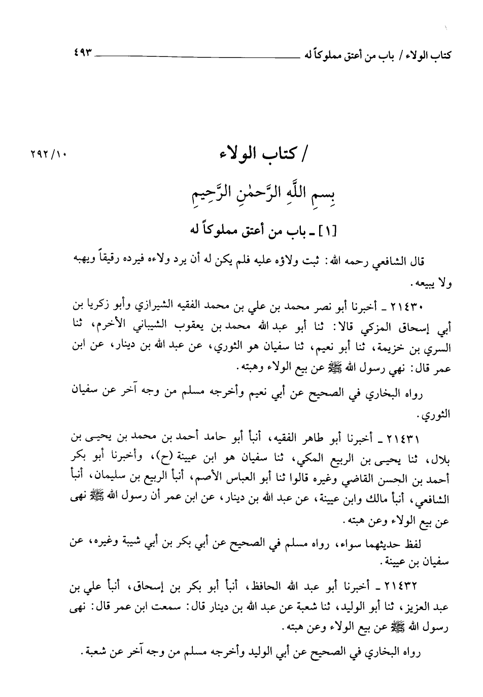 21431 - أَخْبَرَنَا أَبُو طَاهِرٍ الْفَقِيهُ , أنبأ أَبُو حَامِدٍ أَحْمَدُ بْنُ مُحَمَّدِ بْنِ يَحْيَى بْنِ بِلَالٍ , ثنا يَحْيَى بْنُ الرَّبِيعِ الْمَكِّيُّ , ثنا سُفْيَانُ هُوَ ابْنُ عُيَيْنَةَ ح وَأَخْبَرَنَا أَبُو بَكْرٍ أَحْمَدُ بْنُ الْحَسَنِ الْقَاضِي وَغَيْرُهُ، قَالُوا: ثنا أَبُو الْعَبَّاسِ الْأَصَمُّ , أنبأ الرَّبِيعُ بْنُ سُلَيْمَانَ , أنبأ الشَّافِعِيُّ , أنبأ مَالِكٌ , وَابْنُ عُيَيْنَةَ، عَنْ عَبْدِ اللهِ بْنِ دِينَارٍ , عَنِ ابْنِ عُمَرَ، أَنَّ رَسُولَ اللهِ صَلَّى اللهُ عَلَيْهِ وَسَلَّمَ §نَهَى عَنْ بَيْعِ الْوَلَاءِ وَعَنْ هِبَتِهِ. . لَفْظُ حَدِيثِهِمَا سَوَاءٌ. رَوَاهُ مُسْلِمٌ فِي الصَّحِيحِ عَنْ أَبِي بَكْرِ بْنِ أَبِي شَيْبَةَ وَغَيْرِهِ، عَنْ سُفْيَانَ بْنِ عُيَيْنَةَ
