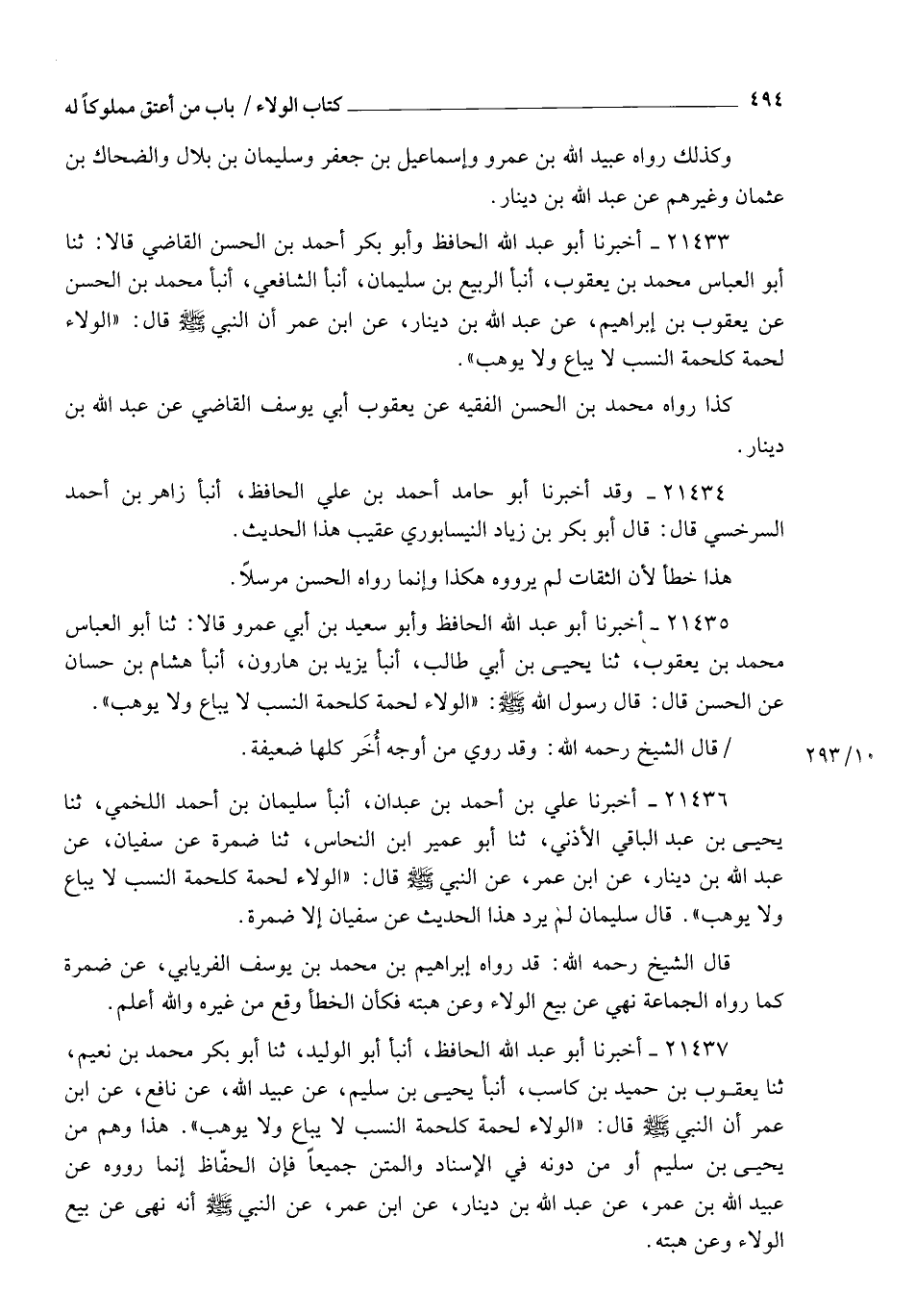 21437 - أَخْبَرَنَا أَبُو عَبْدِ اللهِ الْحَافِظُ , أنبأ أَبُو الْوَلِيدِ , ثنا أَبُو بَكْرٍ مُحَمَّدُ بْنُ نُعَيْمٍ , ثنا يَعْقُوبُ بْنُ حُمَيْدِ بْنِ كَاسِبٍ , أنبأ يَحْيَى بْنُ سُلَيْمٍ , عَنْ عُبَيْدِ اللهِ , عَنْ نَافِعٍ , عَنِ ابْنِ عُمَرَ، أَنَّ النَّبِيَّ صَلَّى اللهُ عَلَيْهِ وَسَلَّمَ قَالَ: §" الْوَلَاءُ لُحْمَةٌ كَلُحْمَةِ النَّسَبِ , لَا يُبَاعُ وَلَا يُوهَبُ " هَذَا وَهْمٌ مِنْ يَحْيَى بْنِ سُلَيْمٍ , أَوْ مَنْ دُونَهُ فِي الْإِسْنَادِ وَالْمَتْنِ جَمِيعًا , فَإِنَّ الْحُفَّاظَ إِنَّمَا رَوَوْهُ، عَنْ عُبَيْدِ اللهِ بْنِ عُمَرَ، عَنْ عَبْدِ اللهِ بْنِ دِينَارٍ، عَنِ ابْنِ عُمَرَ، عَنِ النَّبِيِّ صَلَّى اللهُ عَلَيْهِ وَسَلَّمَ أَنَّهُ نَهَى عَنْ بَيْعِ الْوَلَاءِ وَعَنْ هِبَتِهِ -[495]-