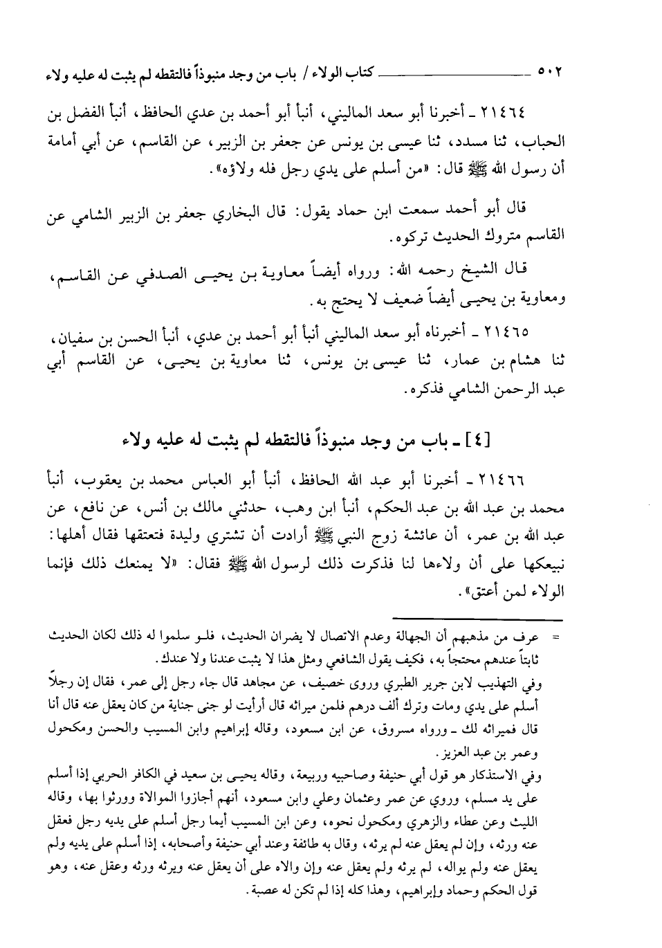 21464 - أَخْبَرَنَا أَبُو سَعْدٍ الْمَالِينِيُّ , أنبأ أَبُو أَحْمَدَ بْنُ عَدِيٍّ الْحَافِظُ , أنبأ الْفَضْلُ بْنُ الْحُبَابِ , ثنا مُسَدَّدٌ , ثنا عِيسَى بْنُ يُونُسَ , عَنْ جَعْفَرِ بْنِ الزُّبَيْرِ , عَنِ الْقَاسِمِ , عَنْ أَبِي أُمَامَةَ، أَنَّ رَسُولَ اللهِ صَلَّى اللهُ عَلَيْهِ وَسَلَّمَ قَالَ: §" مَنْ أَسْلَمَ عَلَى يَدَيِ رَجُلٍ فَلَهُ وَلَاؤُهُ ". قَالَ أَبُو أَحْمَدَ: " سَمِعْتُ ابْنَ حَمَّادٍ يَقُولُ: قَالَ الْبُخَارِيُّ: جَعْفَرُ بْنُ الزُّبَيْرِ الشَّامِيُّ، عَنِ الْقَاسِمِ مَتْرُوكُ الْحَدِيثِ , تَرَكُوهُ ". قَالَ الشَّيْخُ رَحِمَهُ اللهُ: وَرَوَاهُ أَيْضًا مُعَاوِيَةُ بْنُ يَحْيَى الصَّدَفِيُّ، عَنِ الْقَاسِمِ , وَمُعَاوِيَةُ بْنُ يَحْيَى أَيْضًا ضَعِيفٌ , لَا يُحْتَجُّ بِهِ.