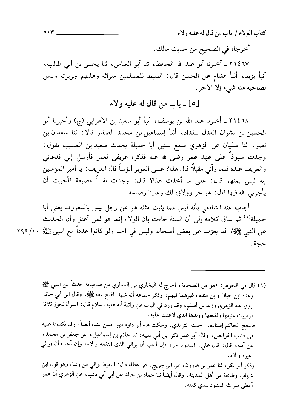 21468 - أَخْبَرَنَا عَبْدُ اللهِ بْنُ يُوسُفَ , أنبأ أَبُو سَعِيدِ بْنُ الْأَعْرَابِيِّ ح وَأَخْبَرَنَا أَبُو الْحُسَيْنِ بْنُ بِشْرَانَ الْعَدْلُ، بِبَغْدَادَ , أنبأ إِسْمَاعِيلُ بْنُ مُحَمَّدٍ الصَّفَّارُ قَالَا: ثنا سَعْدَانُ بْنُ نَصْرٍ , ثنا سُفْيَانُ , عَنِ الزُّهْرِيِّ , سَمِعَ سِنِينَ أَبَا جَمِيلَةَ، يُحَدِّثُ سَعِيدَ بْنَ الْمُسَيِّبِ يَقُولُ: وَجَدْتُ مَنْبُوذًا عَلَى عَهْدِ عُمَرَ رَضِيَ اللهُ عَنْهُ , فَذَكَرَهُ عَرِيفِي لِعُمَرَ , فَأَرْسَلَ إِلِيَّ فَدَعَانِي وَالْعَرِيفُ عِنْدَهُ , فَلَمَّا رَآنِي مُقْبِلًا قَالَ: هَذَا؟ عَسَى الْغُوَيْرُ أَبْؤُسًا , قَالَ الْعَرِيفُ: يَا أَمِيرَ الْمُؤْمِنِينَ , إِنَّهُ لَيْسَ بِمُتَّهَمٍ , قَالَ: عَلَى مَا أَخَذْتَ هَذَا؟ قَالَ: " وَجَدْتُ نَفْسًا مُضَيَّعَةً , فَأَحْبَبْتُ أَنْ يَأْجُرَنِيَ اللهُ فِيهَا , قَالَ: §" هُوَ حُرٌّ وَوَلَاؤُهُ لَكَ , وَعَلَيْنَا رَضَاعُهُ ". أَجَابَ عَنْهُ الشَّافِعِيُّ بِأَنَّهُ: " لَيْسَ مِمَّا يَثْبتُ مِثْلُهُ هُوَ، عَنْ رَجُلٍ لَيْسَ بِالْمَعْرُوفِ - يَعْنِي: أَبَا جَمِيلَةَ. ثُمَّ سَاقَ كَلَامَهُ إِلَى أَنَّ السُّنَّةَ جَاءَتْ بِأَنَّ الْوَلَاءَ إِنَّمَا هُوَ لِمَنْ أَعْتَقَ , وَأَنَّ الْحَدِيثَ عَنِ النَّبِيِّ صَلَّى اللهُ عَلَيْهِ وَسَلَّمَ قَدْ يَعْزُبُ عَنْ بَعْضِ أَصْحَابِهِ , وَلَيْسَ فِي أَحَدٍ وَلَوْ كَانُوا عَدَدًا مَعَ النَّبِيِّ صَلَّى اللهُ عَلَيْهِ وَسَلَّمَ حُجَّةٌ ".