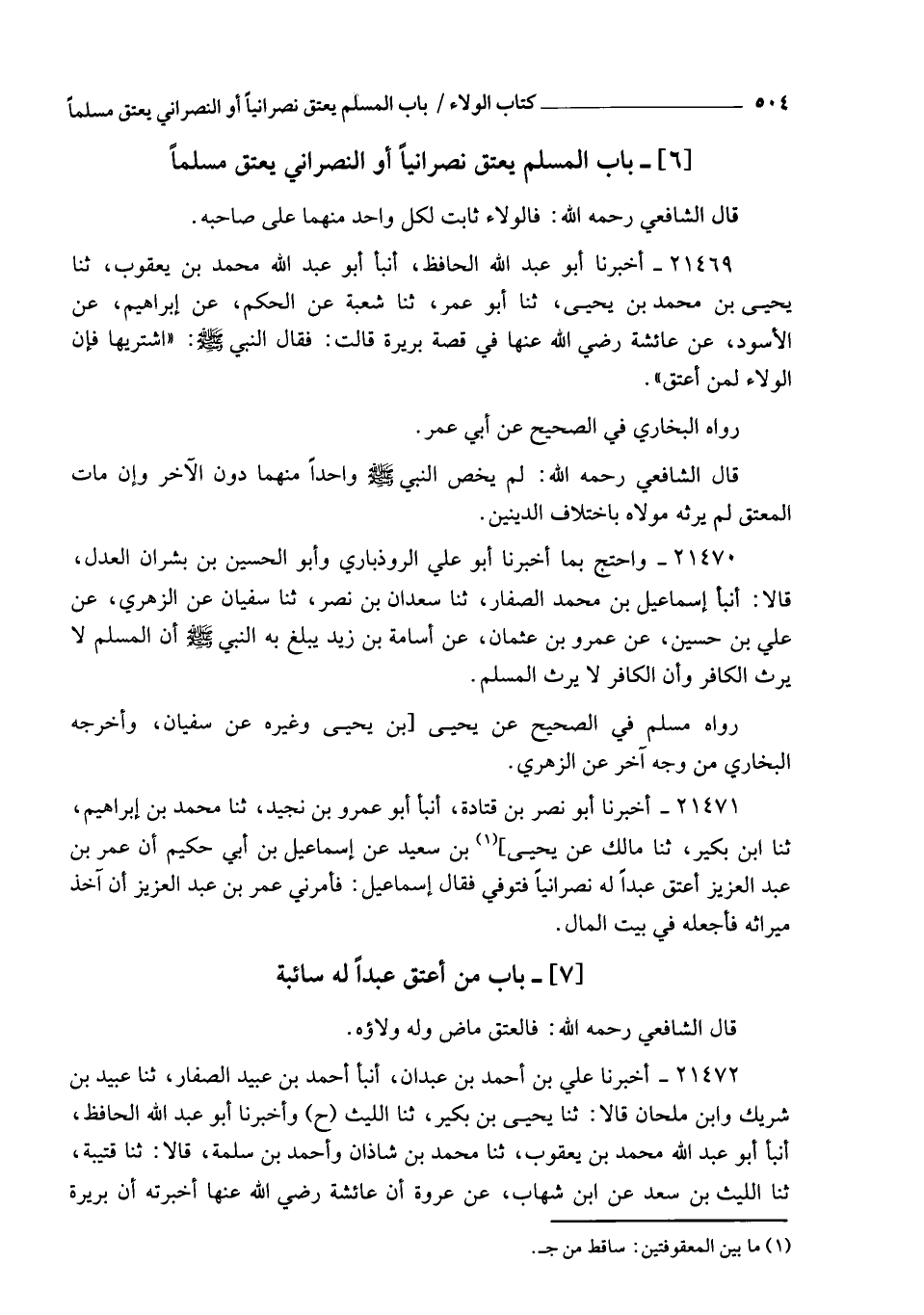 21469 - أَخْبَرَنَا أَبُو عَبْدِ اللهِ الْحَافِظُ , أنبأ أَبُو عَبْدِ اللهِ مُحَمَّدُ بْنُ يَعْقُوبَ , ثنا يَحْيَى بْنُ مُحَمَّدِ بْنِ يَحْيَى , ثنا أَبُو عُمَرَ , ثنا شُعْبَةُ , عَنِ الْحَكَمِ , عَنْ إِبْرَاهِيمَ , عَنِ الْأَسْوَدِ , عَنْ عَائِشَةَ رَضِيَ اللهُ عَنْهَا فِي قِصَّةِ بَرِيرَةَ قَالَتْ: فَقَالَ النَّبِيُّ صَلَّى اللهُ عَلَيْهِ وَسَلَّمَ: " اشْتَرِيهَا , §فَإِنَّ الْوَلَاءَ لِمَنْ أَعْتَقَ " رَوَاهُ الْبُخَارِيُّ فِي الصَّحِيحِ، عَنْ أَبِي عُمَرَ. قَالَ الشَّافِعِيُّ رَحِمَهُ اللهُ: " لَمْ يَخُصَّ النَّبِيُّ صَلَّى اللهُ عَلَيْهِ وَسَلَّمَ وَاحِدًا مِنْهُمَا دُونَ الْآخَرِ , وَإِنْ مَاتَ الْمُعْتِقُ لَمْ يَرِثْهُ مَوْلَاهُ بِاخْتِلَافِ الدِّينَيْنِ ".