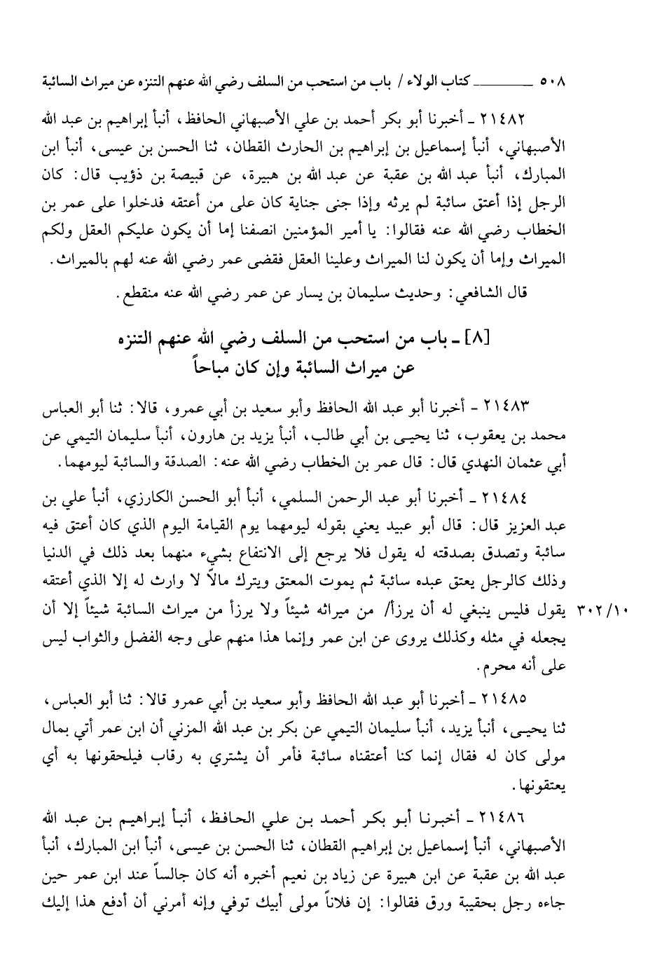 21486 - أَخْبَرَنَا أَبُو بَكْرٍ أَحْمَدُ بْنُ عَلِيٍّ الْحَافِظُ , أنبأ إِبْرَاهِيمُ بْنُ عَبْدِ اللهِ الْأَصْبَهَانِيُّ , أنبأ إِسْمَاعِيلُ بْنُ إِبْرَاهِيمَ الْقَطَّانُ , ثنا الْحَسَنُ بْنُ عِيسَى , أنبأ ابْنُ الْمُبَارَكِ , أنبأ عَبْدُ اللهِ بْنُ عُقْبَةَ , عَنِ ابْنِ هُبَيْرَةَ , عَنْ زِيَادِ بْنِ نُعَيْمٍ , أَخْبَرَهُ أَنَّهُ، كَانَ جَالِسًا عِنْدَ ابْنِ عُمَرَ حِينَ جَاءَهُ رَجُلٌ بِحَقِيبَةِ وَرِقٍ , فَقَالُوا: إِنَّ فُلَانًا مَوْلَى أَبِيكَ تُوُفِّيَ , وَإِنَّهُ أَمَرَنِي أَنْ أَدْفَعَ هَذِهِ إِلَيْكَ , -[509]- قَالَ: " وَيْحَهُ , §أَلَا أَنْفَقَهُ فِي سَبِيلِ اللهِ " , فَجَاءَهُ رَسُولُ عَاصِمِ بْنِ عُمَرَ أَنِ ابْعَثْ إِلِيَّ بِمِيرَاثِهِ مِنْ مَوْلَى أَبِيهِ , فَبَعَثَهُ إِلَيْهِ كُلَّهُ , وَكَانَ ابْنُ عُمَرَ لَا يَرِثُ السَّائِبَةَ , وَكَانَ عُمَرُ رَضِيَ اللهُ عَنْهُ أَعْتَقَهُ سَائِبَةً. . قَالَ الشَّيْخُ رَحِمَهُ اللهُ: " هَذَا إِنْ صَحَّ يَدُلُّ عَلَى أَنَّهُ كَانَ لَا يَرَاهُ حَرَامًا , إِذْ لَوْ رَآهُ حَرَامًا لَمَنَعَهُ مِنْ أَخِيهِ عَاصِمٍ , كَمَا امْتَنَعَ مِنْهُ , وَلَكِنَّهُ اسْتَحَبَّ التَّنَزُّهَ عَنْهُ , وَاللهُ أَعْلَمُ.