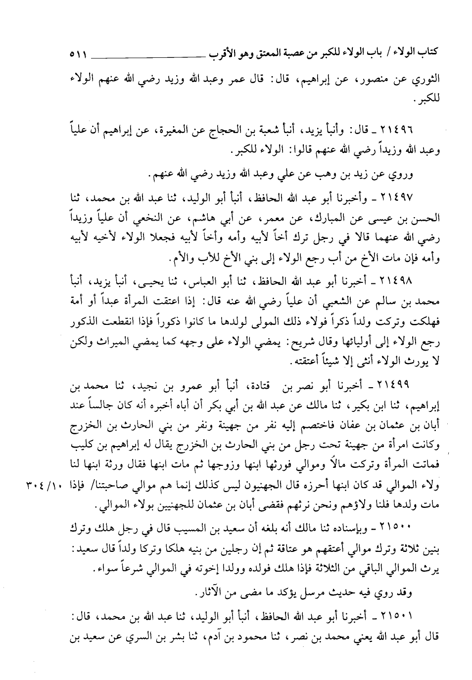 21499 - أَخْبَرَنَا أَبُو نَصْرِ بْنُ قَتَادَةَ , أنبأ أَبُو عَمْرِو بْنُ نُجَيْدٍ , ثنا مُحَمَّدُ بْنُ إِبْرَاهِيمَ , ثنا ابْنُ بُكَيْرٍ , ثنا مَالِكٌ , عَنْ عَبْدِ اللهِ بْنِ أَبِي بَكْرٍ، أَنَّ أَبَاهُ، أَخْبَرَهُ أَنَّهُ، كَانَ جَالِسًا عِنْدَ أَبَانَ بْنِ عُثْمَانَ بْنِ عَفَّانَ , فَاخْتَصَمَ إِلَيْهِ نَفَرٌ مِنْ جُهَيْنَةَ , وَنَفَرٌ مِنْ بَنِي الْحَارِثِ بْنِ الْخَزْرَجِ , وَكَانَتِ امْرَأَةٌ مِنْ جُهَيْنَةَ تَحْتَ رَجُلٍ مِنْ بَنِي الْحَارِثِ بْنِ الْخَزْرَجِ يُقَالُ لَهُ إِبْرَاهِيمُ بْنُ كُلَيْبٍ , فَمَاتَتِ الْمَرْأَةُ , وَتَرَكَتْ مَالًا وَمَوَالِيَ , فَوَرِثَهَا ابْنُهَا وَزَوْجُهَا , ثُمَّ مَاتَ ابْنُهَا فَقَالَ وَرَثَةُ ابْنِهَا: لَنَا وَلَاءُ الْمَوَالِي , قَدْ كَانَ ابْنُهَا أَحْرَزَهُ , قَالَ الْجُهَنِيُّونَ: لَيْسَ كَذَلِكَ , إِنَّمَا هُمْ مَوَالِي صَاحِبَتِنَا , فَإِذَا مَاتَ وَلَدُهَا فَلَنَا وَلَاؤُهُمْ وَنَحْنُ نَرِثُهُمْ , §فَقَضَى أَبَانُ بْنُ عُثْمَانَ لِلْجُهَنِيِّينَ بِوَلَاءِ الْمَوَالِي.