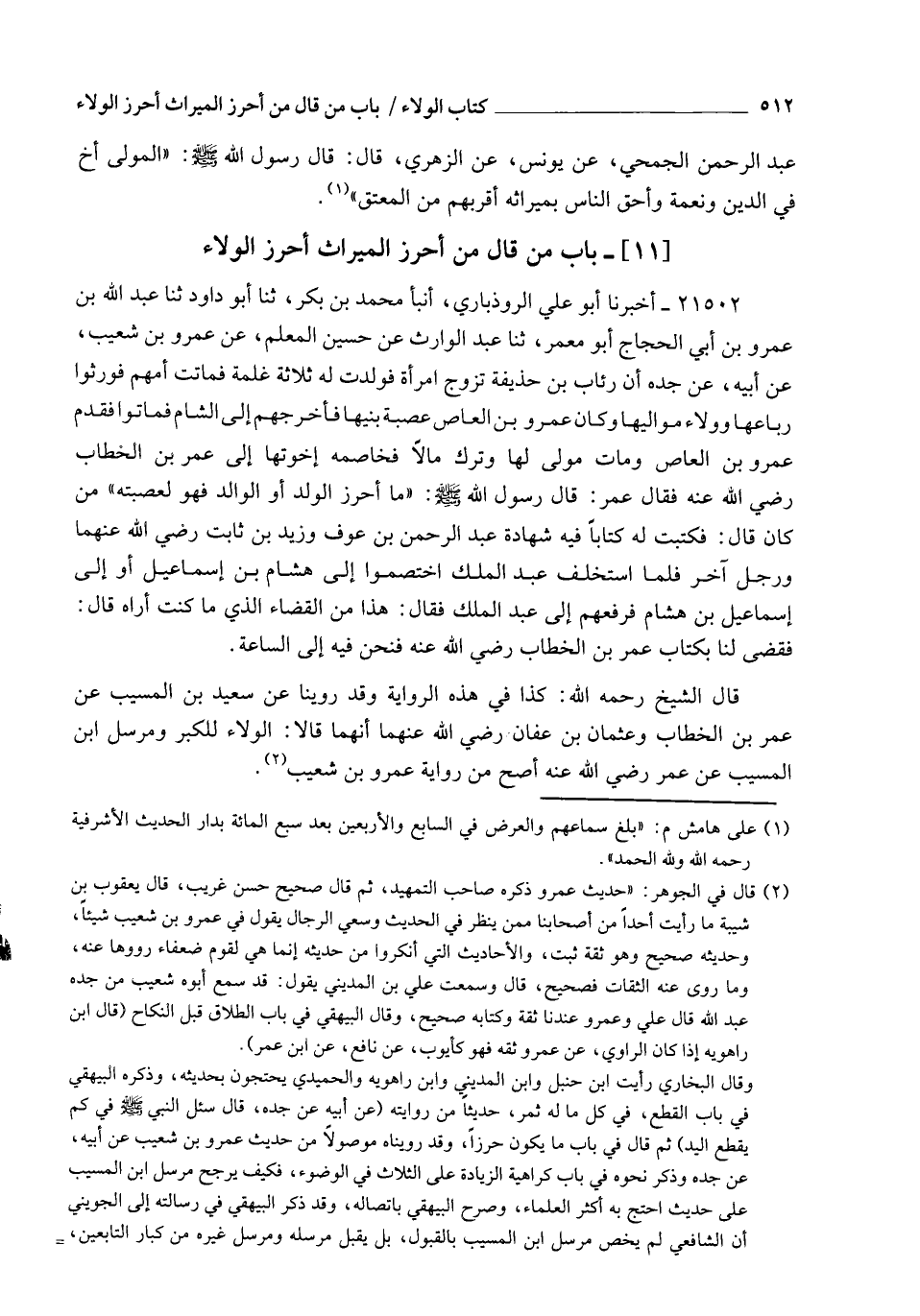 21502 - أَخْبَرَنَا أَبُو عَلِيٍّ الرُّوذْبَارِيُّ , أنبأ مُحَمَّدُ بْنُ بَكْرٍ , ثنا أَبُو دَاوُدَ , ثنا عَبْدُ اللهِ بْنُ عَمْرِو بْنِ أَبِي الْحَجَّاجِ أَبُو مَعْمَرٍ , ثنا عَبْدُ الْوَارِثِ , عَنْ حُسَيْنٍ الْمُعَلِّمِ , عَنْ عَمْرِو بْنِ شُعَيْبٍ , عَنْ أَبِيهِ , عَنْ جَدِّهِ، أَنَّ رِئَابَ بْنَ حُذَيْفَةَ تَزَوَّجَ امْرَأَةً , فَوَلَدَتْ لَهُ ثَلَاثَةَ أَغْلِمَةٍ , فَمَاتَتْ أُمُّهُمْ , فَوَرِثُوا رِبَاعَهَا وَوَلَاءَ مَوَالِيهَا , وَكَانَ عَمْرُو بْنُ الْعَاصِ عَصَبَةَ بَنِيهَا , فَأَخْرَجَهُمْ إِلَى الشَّامِ , فَمَاتُوا , فَقَدِمَ عَمْرُو بْنُ الْعَاصِ , وَمَاتَ مَوْلًى لَهَا , وَتَرَكَ مَالًا , فَخَاصَمَهُ إِخْوَتُهَا إِلَى عُمَرَ بْنِ الْخَطَّابِ رَضِيَ اللهُ عَنْهُ، فَقَالَ عُمَرُ: قَالَ رَسُولُ اللهِ صَلَّى اللهُ عَلَيْهِ وَسَلَّمَ: §" مَا أَحْرَزَ الْوَلَدُ أَوِ الْوَالِدُ فَهُوَ لِعَصَبَتِهِ مَنْ كَانَ " , قَالَ: فَكَتَبْتُ لَهُ كِتَابًا فِيهِ شَهَادَةُ عَبْدِ الرَّحْمَنِ بْنِ عَوْفٍ , وَزَيْدِ بْنِ ثَابِتٍ رَضِيَ اللهُ عَنْهُمَا , وَرَجُلٍ آخَرَ , فَلَمَّا اسْتُخْلِفَ عَبْدُ الْمَلِكِ اخْتَصَمُوا إِلَى هِشَامِ بْنِ إِسْمَاعِيلَ أَوْ إِلَى إِسْمَاعِيلَ بْنِ هِشَامٍ , فَرَفَعَهُمْ إِلَى عَبْدِ الْمَلِكِ، فَقَالَ: هَذَا مِنَ الْقَضَاءِ الَّذِي مَا كُنْتُ أَرَاهُ , قَالَ: فَقَضَى لَنَا بِكِتَابِ عُمَرَ بْنِ الْخَطَّابِ رَضِيَ اللهُ عَنْهُ , فَنَحْنُ فِيهِ إِلَى السَّاعَةِ. قَالَ الشَّيْخُ رَحِمَهُ اللهُ: " كَذَا فِي هَذِهِ الرِّوَايَةِ , وَقَدْ رُوِّينَا، عَنْ سَعِيدِ بْنِ الْمُسَيِّبِ، عَنْ عُمَرَ بْنِ الْخَطَّابِ , وَعُثْمَانَ بْنِ عَفَّانَ رَضِيَ اللهُ عَنْهُمَا , فَإِنَّهُمَا قَالَا: " الْوَلَاءُ لِلْكُبْرِ ". وَمُرْسَلُ ابْنِ الْمُسَيِّبِ، عَنْ عُمَرَ رَضِيَ اللهُ عَنْهُ أَصَحُّ مِنْ رِوَايَةِ عَمْرِو بْنِ شُعَيْبٍ , -[513]- وَأَمَّا الْحَدِيثُ الْمَرْفُوعُ فِيهِ , فَلَيْسَ فِيهِ أَنَّ النَّبِيَّ صَلَّى اللهُ عَلَيْهِ وَسَلَّمَ قَالَ ذَلِكَ فِي الْوَلَاءِ.