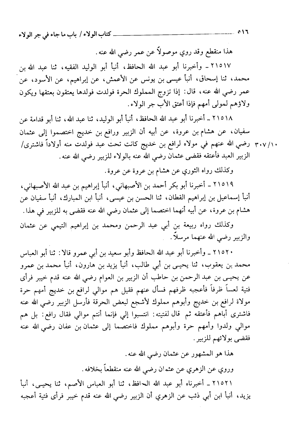 21521 - أَخْبَرَنَاهُ أَبُو عَبْدِ اللهِ الْحَافِظُ , ثنا أَبُو الْعَبَّاسِ الْأَصَمُّ , ثنا يَحْيَى , أنبأ يَزِيدُ , أنبأ ابْنُ أَبِي ذِئْبٍ , عَنِ الزُّهْرِيِّ، أَنَّ الزُّبَيْرَ رَضِيَ اللهُ عَنْهُ قَدِمَ خَيْبَرَ , فَرَأَى فِتْيَةً أَعْجَبَهُ -[517]- حَالُهُمْ , فَسَأَلَ عَنْهُمْ , فَقِيلَ: هُمْ مَوَالٍ لِبَنِي حَارِثَةَ , أُمُّهُمْ حُرَّةٌ مَوْلَاةٌ لِبَنِي حَارِثَةَ , وَأَبُوهُمْ مَمْلُوكٌ , فَأَرْسَلَ إِلَى أَبِيهِمْ فَاشْتَرَاهُ فَأَعْتَقَهُ , فَاخْتَصَمَ هُوَ وَبَنُو حَارِثَةَ إِلَى عُثْمَانَ بْنِ عَفَّانَ رَضِيَ اللهُ عَنْهُ فِي الْوَلَاءِ , فَقَضَى عُثْمَانُ رَضِيَ اللهُ عَنْهُ بِالْوَلَاءِ لِبَنِي حَارِثَةَ , وَقَالَ عُثْمَانُ رَضِيَ اللهُ عَنْهُ: §" الْوَلَاءُ لَا يَجُرُّ " كَذَا قَالَ وَالرِّوَايَةُ الْأُولَى عَنْ عُثْمَانَ رَضِيَ اللهُ عَنْهُ أَصَحُّ بِشَوَاهِدِهَا , وَمَرَاسِيلُ الزُّهْرِيِّ رَدِيئَةٌ.