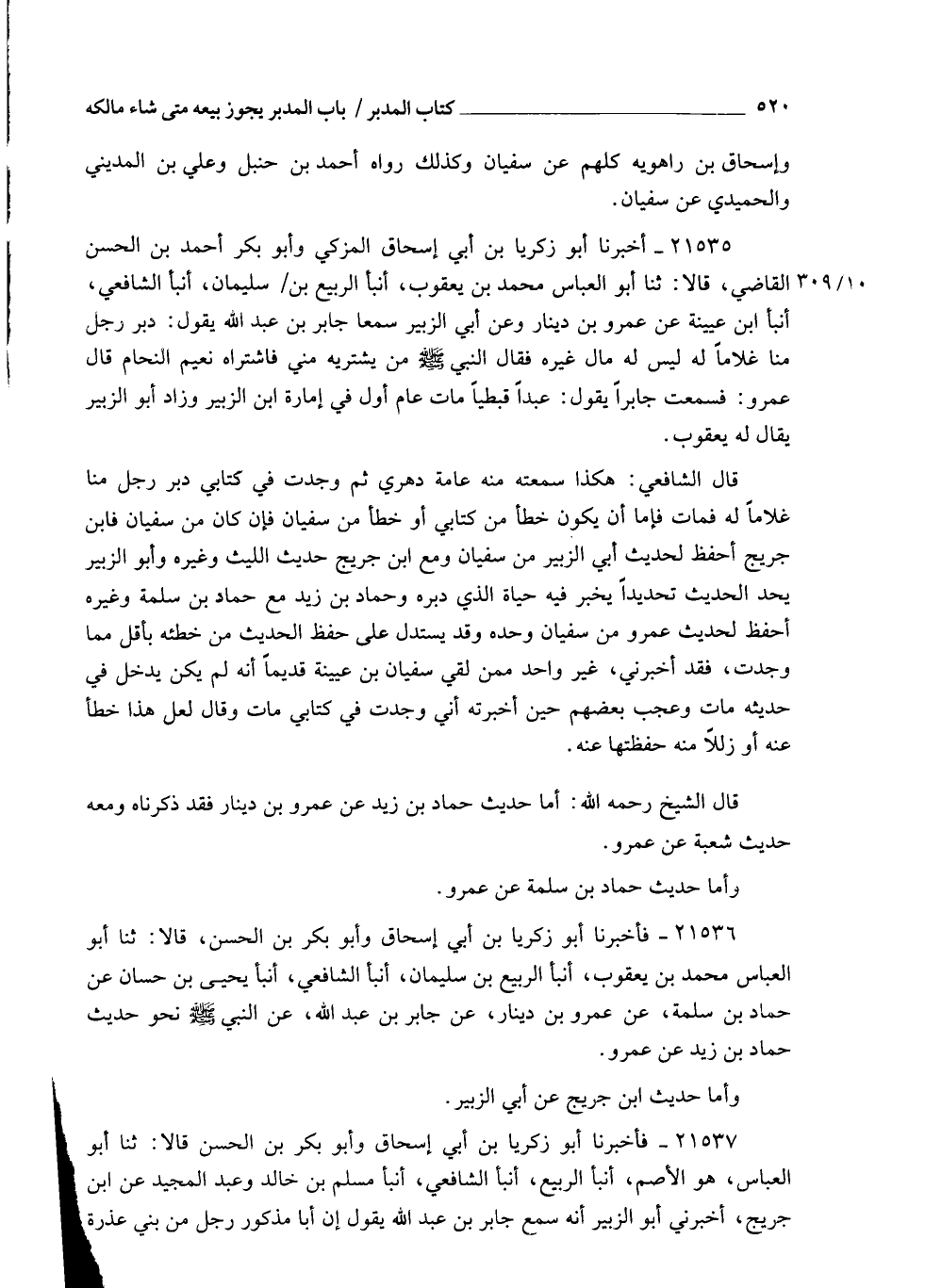 21535 - أَخْبَرَنَا أَبُو زَكَرِيَّا بْنُ أَبِي إِسْحَاقَ الْمُزَكِّي , وَأَبُو بَكْرٍ أَحْمَدُ بْنُ الْحَسَنِ الْقَاضِي قَالَا: ثنا أَبُو الْعَبَّاسِ مُحَمَّدُ بْنُ يَعْقُوبَ , أنبأ الرَّبِيعُ بْنُ سُلَيْمَانَ , أنبأ الشَّافِعِيُّ , أنبأ ابْنُ عُيَيْنَةَ , عَنْ عَمْرِو بْنِ دِينَارٍ , وَعَنْ أَبِي الزُّبَيْرِ، سَمِعَا جَابِرَ بْنَ عَبْدِ اللهِ يَقُولُ: دَبَّرَ رَجُلٌ مِنَّا غُلَامًا لَهُ لَيْسَ لَهُ مَالٌ غَيْرُهُ، فَقَالَ النَّبِيُّ صَلَّى اللهُ عَلَيْهِ وَسَلَّمَ: §" مَنْ يَشْتَرِيهِ مِنِّي "؟ فَاشْتَرَاهُ نُعَيْمٌ النَّحَّامُ , قَالَ عَمْرٌو: فَسَمِعْتُ جَابِرًا يَقُولُ: عَبْدًا قِبْطِيًّا مَاتَ عَامَ أَوَّلٍ فِي إِمَارَةِ ابْنِ الزُّبَيْرِ , وَزَادَ أَبُو الزُّبَيْرِ: يُقَالُ لَهُ يَعْقُوبُ. قَالَ الشَّافِعِيُّ: " هَكَذَا سَمِعْتُهُ مِنْهُ عَامَّةَ دَهْرِي , ثُمَّ وَجَدْتُ فِي كِتَابِي: دَبَّرَ رَجُلٌ مِنَّا غُلَامًا لَهُ فَمَاتَ , فَإِمَّا أَنْ يَكُونَ خَطَأً مِنْ كِتَابِي , أَوْ خَطَأً مِنْ سُفْيَانَ , فَإِنْ كَانَ مِنْ سُفْيَانَ فَابْنُ جُرَيْجٍ أَحْفَظُ لِحَدِيثِ أَبِي الزُّبَيْرِ مِنْ سُفْيَانَ , وَمَعَ ابْنِ جُرَيْجٍ حَدِيثُ اللَّيْثِ وَغَيْرِهِ , وَأَبُو الزُّبَيْرِ يُحَدِّثُ الْحَدِيثَ تَحْدِيدًا , يُخْبِرُ فِيهِ حَيَاةَ الَّذِي دَبَّرَهُ , وَحَمَّادُ بْنُ زَيْدٍ , مَعَ حَمَّادِ بْنِ سَلَمَةَ وَغَيْرِهِ أَحْفَظُ لِحَدِيثِ عَمْرٍو مِنْ سُفْيَانَ وَحْدَهُ , وَقَدْ يُسْتَدَلُّ عَلَى حِفْظِ الْحَدِيثِ مِنْ خَطَئِهِ بِأَقَلَّ مِمَّا وَجَدْتُ , فَقَدْ أَخْبَرَنِي غَيْرُ وَاحِدٍ مِمَّنْ لَقِيَ سُفْيَانَ بْنَ عُيَيْنَةَ قَدِيمًا أَنَّهُ لَمْ يَكُنْ يُدْخِلُ فِي حَدِيثِهِ: مَاتَ , وَعَجِبَ بَعْضُهُمْ حِينَ أَخْبَرْتُهُ أَنِّي وَجَدْتُ فِي كِتَابِي: مَاتَ , وَقَالَ: لَعَلَّ هَذَا خَطَأٌ عَنْهُ , أَوْ زَلَلٌ مِنْهُ , حَفِظْتَهَا عَنْهُ. قَالَ الشَّيْخُ رَحِمَهُ اللهُ: أَمَّا حَدِيثُ حَمَّادِ بْنِ زَيْدٍ، عَنْ عَمْرِو بْنِ دِينَارٍ فَقَدْ ذَكَرْنَاهُ وَمَعَهُ حَدِيثُ شُعْبَةَ، عَنْ عَمْرٍو , وَأَمَّا حَدِيثُ حَمَّادِ بْنِ سَلَمَةَ، عَنْ عَمْرٍو: