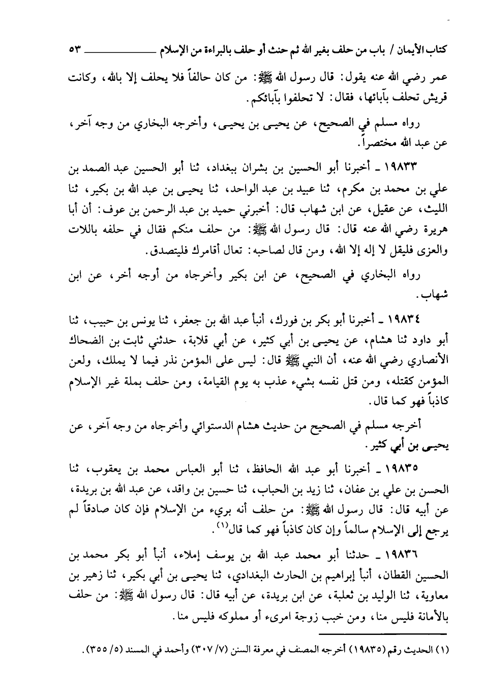 19833 - أَخْبَرَنَا أَبُو الْحُسَيْنِ بْنُ بِشْرَانَ بِبَغْدَادَ، ثنا أَبُو الْحُسَيْنِ عَبْدُ الصَّمَدِ بْنُ عَلِيِّ بْنِ مُحَمَّدِ بْنِ مُكْرَمٍ، ثنا عُبَيْدُ بْنُ عَبْدِ الْوَاحِدِ، ثنا يَحْيَى بْنُ عَبْدِ اللهِ بْنِ بُكَيْرٍ، ثنا اللَّيْثُ، عَنْ عُقَيْلٍ، عَنِ ابْنِ شِهَابٍ، قَالَ: أَخْبَرَنِي حُمَيْدُ بْنُ عَبْدِ الرَّحْمَنِ بْنِ عَوْفٍ، أَنَّ أَبَا هُرَيْرَةَ رَضِيَ اللهُ عَنْهُ قَالَ: قَالَ رَسُولُ اللهِ صَلَّى اللهُ عَلَيْهِ وَسَلَّمَ: " §مَنْ حَلَفَ مِنْكُمْ , فَقَالَ فِي حَلِفِهِ بِاللَّاتِ وَالْعُزَّى، فَلْيَقُلْ: لَا إِلَهَ إِلَّا اللهُ، وَمَنْ قَالَ لِصَاحِبِهِ تَعَالَ أُقَامِرْكَ فَلْيَتَصَدَّقْ ". رَوَاهُ الْبُخَارِيُّ فِي الصَّحِيحِ، عَنِ ابْنِ بُكَيْرٍ، وَأَخْرَجَاهُ مِنْ أَوْجُهٍ أُخَرَ عَنِ ابْنِ شِهَابٍ