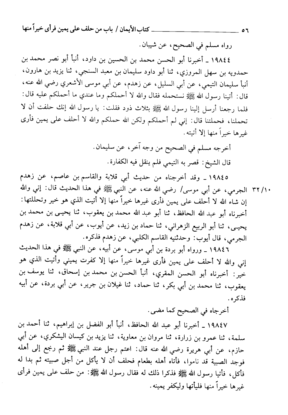 19844 - أَخْبَرَنَا أَبُو الْحَسَنِ مُحَمَّدُ بْنُ الْحُسَيْنِ بْنِ دَاوُدَ، أنبأ أَبُو نَصْرٍ مُحَمَّدُ بْنُ حَمْدَوَيْهِ بْنِ سَهْلٍ الْمَرْوَزِيُّ، ثنا أَبُو دَاوُدَ سُلَيْمَانُ بْنُ مَعْبَدٍ السِّنْجِيُّ، ثنا يَزِيدُ بْنُ هَارُونَ، أنبأ سُلَيْمَانُ التَّيْمِيُّ، عَنْ أَبِي السَّلِيلِ، عَنْ زَهْدَمٍ، عَنْ أَبِي مُوسَى الْأَشْعَرِيِّ رَضِيَ اللهُ عَنْهُ , قَالَ: أَتَيْنَا رَسُولَ اللهِ صَلَّى اللهُ عَلَيْهِ وَسَلَّمَ نَسْتَحْمِلُهُ فَقَالَ: " وَاللهِ لَا أَحْمِلُكُمْ، وَمَا عِنْدِي مَا أَحْمِلُكُمْ عَلَيْهِ"، قَالَ: فَلَمَّا رَجَعْنَا أَرْسَلَ إِلَيْنَا رَسُولُ اللهِ صَلَّى اللهُ عَلَيْهِ وَسَلَّمَ بِثَلَاثٍ ذَوْدٍ، فَقُلْتُ: يَا رَسُولَ اللهِ , إِنَّكَ حَلَفْتَ أَنْ لَا تَحْمِلَنَا فَحَمَلْتَنَا، قَالَ: " أَنِّي §لَمْ أَحْمِلُكُمْ وَلَكِنَّ اللهَ حَمَلَكُمْ، وَاللهِ لَا أَحْلِفُ عَلَى يَمِينٍ، فَأَرَى غَيْرَهَا خَيْرًا مِنْهَا إِلَّا أَتَيْتُهُ"، أَخْرَجَهُ مُسْلِمٌ فِي الصَّحِيحِ مِنْ وَجْهٍ آخَرَ , عَنْ سُلَيْمَانَ. قَالَ الشَّيْخُ: قَصَرَ بِهِ التَّيْمِيُّ فَلَمْ يَنْقُلْ فِيهِ الْكَفَّارَةَ