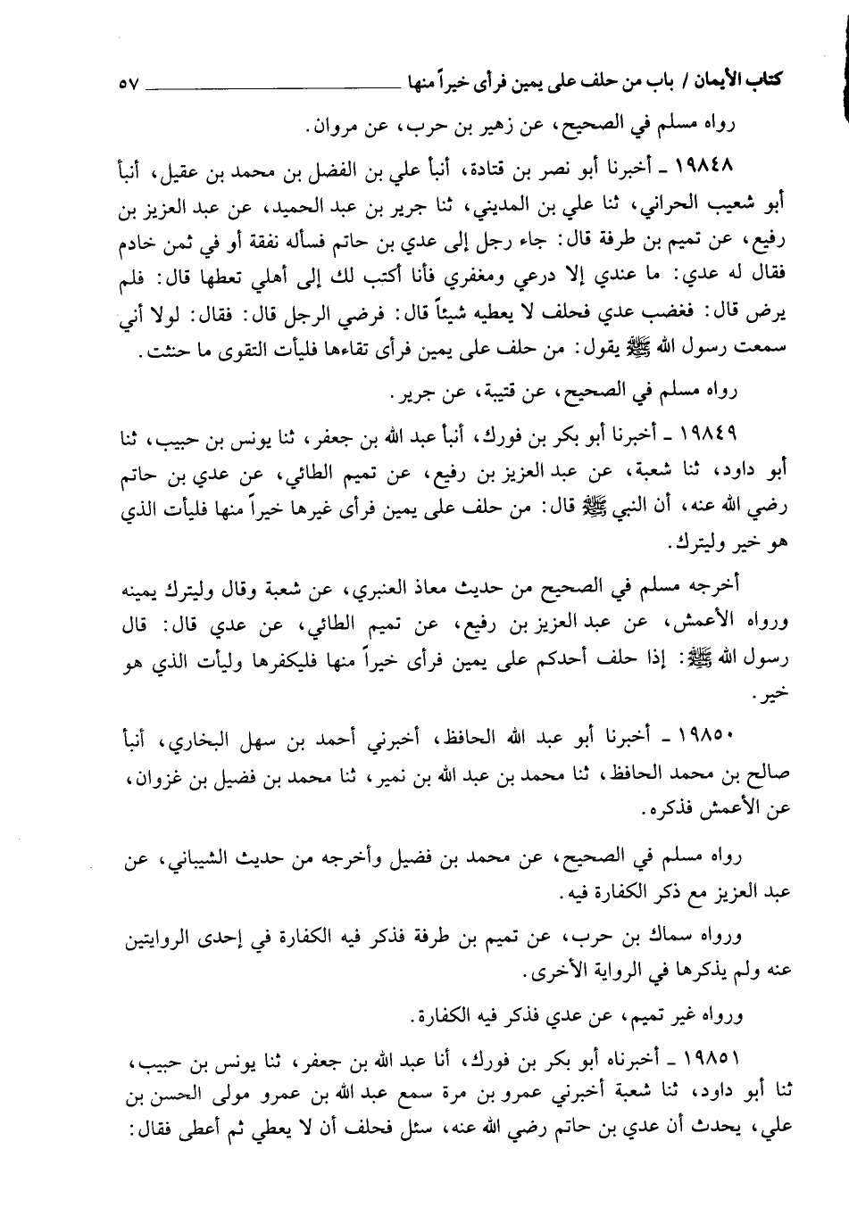 19848 - أَخْبَرَنَا أَبُو نَصْرِ بْنُ قَتَادَةَ، أنبأ عَلِيُّ بْنُ الْفَضْلِ بْنِ مُحَمَّدِ بْنِ عَقِيلٍ، أنبأ أَبُو شُعَيْبٍ الْحَرَّانِيُّ، ثنا عَلِيُّ بْنُ الْمَدِينِيُّ، ثنا جَرِيرُ بْنُ عَبْدِ الْحَمِيدِ، عَنْ عَبْدِ الْعَزِيزِ بْنِ رُفَيْعٍ، عَنْ تَمِيمِ بْنِ طَرَفَةَ، قَالَ: جَاءَ رَجُلٌ إِلَى عَدِيِّ بْنِ حَاتِمٍ، فَسَأَلَهُ نَفَقَةً، أَوْ فِي ثَمَنِ خَادِمٍ، فَقَالَ لَهُ عَدِيُّ: مَا عِنْدِي إِلَّا دِرْعِي وَمِغْفَرِي، فَأَنَا أَكْتُبُ لَكَ إِلَى أَهْلِي تُعْطَهَا، قَالَ: فَلَمْ يَرْضَ، قَالَ: فَغَضِبَ عَدِيُّ فَحَلَفَ لَا يُعْطِيهِ شَيْئًا، قَالَ: فَرَضِيَ الرَّجُلُ، قَالَ: فَقَالَ: لَوْلَا أَنِّي سَمِعْتُ رَسُولَ اللهِ صَلَّى اللهُ عَلَيْهِ وَسَلَّمَ يَقُولُ: " §مَنْ حَلَفَ عَلَى يَمِينٍ، فَرَأَى تُقَاءَهَا، فَلْيَأْتِ التَّقْوَى مَا حَنَثَتْ "، رَوَاهُ مُسْلِمٌ فِي الصَّحِيحِ، عَنْ قُتَيْبَةَ، عَنْ جَرِيرٍ