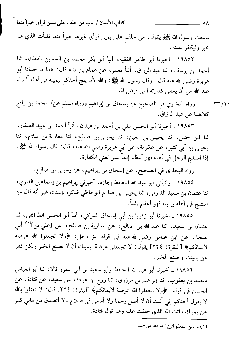 19852 - أَخْبَرَنَا أَبُو طَاهِرٍ الْفَقِيهُ، أنبأ أَبُو بَكْرٍ مُحَمَّدُ بْنُ الْحُسَيْنِ الْقَطَّانُ، ثنا أَحْمَدُ بْنُ يُوسُفَ، ثنا عَبْدُ الرَّزَّاقِ، أنبأ مَعْمَرٌ، عَنْ هَمَّامِ بْنِ مُنَبِّهٍ، قَالَ: هَذَا مَا حَدَّثَنَا أَبُو هُرَيْرَةَ رَضِيَ اللهُ عَنْهُ قَالَ: وَقَالَ رَسُولُ اللهِ صَلَّى اللهُ عَلَيْهِ وَسَلَّمَ: §" وَاللهِ لَأَنْ يَلِجَ أَحَدُكُمْ بِيَمِينِهِ فِي أَهْلِهِ آثَمُ لَهُ عِنْدَ اللهِ مِنْ أَنْ يُعْطِيَ كَفَّارَتَهُ الَّتِي فَرَضَ اللهُ "، رَوَاهُ الْبُخَارِيُّ فِي الصَّحِيحِ، عَنْ إِسْحَاقَ بْنِ إِبْرَاهِيمَ , وَرَوَاهُ مُسْلِمٌ، عَنْ مُحَمَّدِ بْنِ رَافِعٍ كِلَاهُمَا، عَنْ عَبْدِ الرَّزَّاقِ