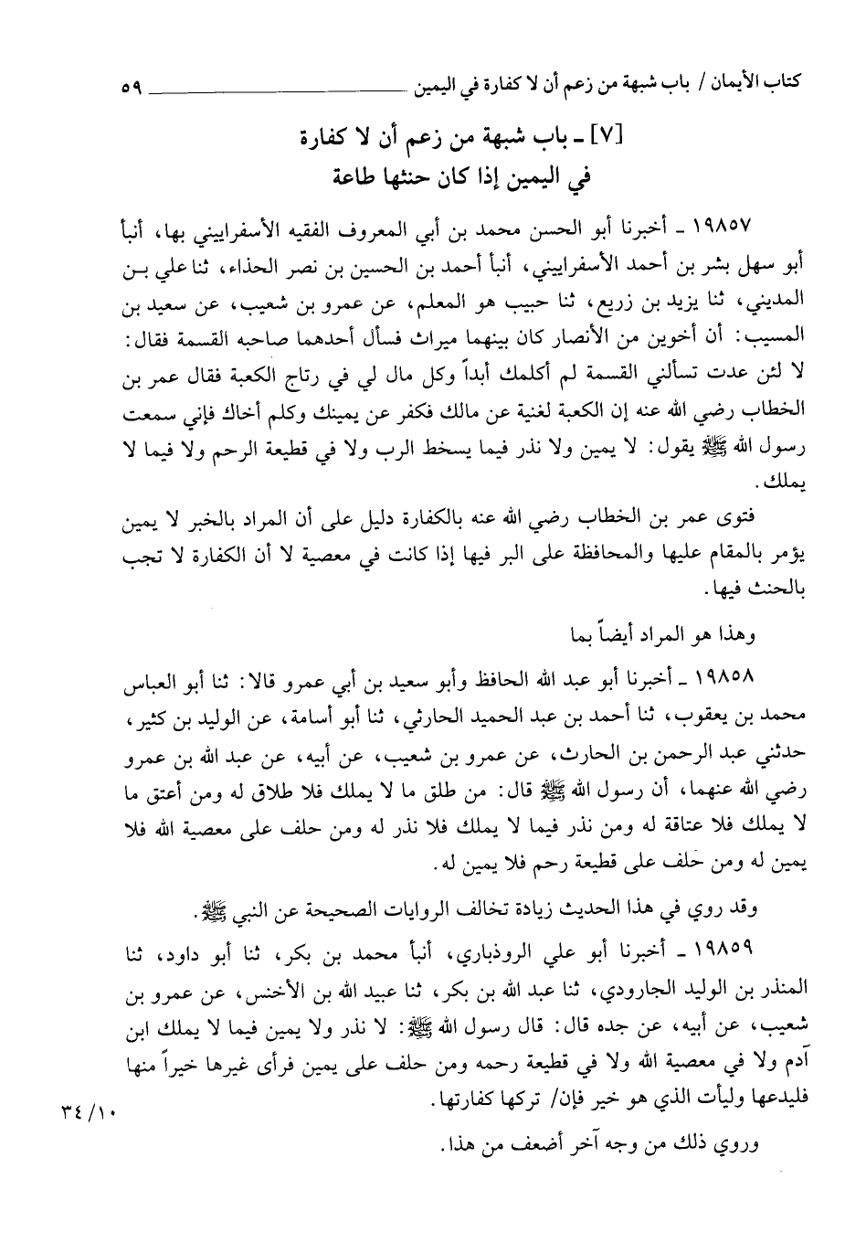 19857 - أَخْبَرَنَا أَبُو الْحَسَنِ مُحَمَّدُ بْنُ أَبِي الْمَعْرُوفِ الْفَقِيهُ الْإِسْفَرَايِينِيُّ بِهَا، أنبأ أَبُو سَهْلٍ بِشْرُ بْنُ أَحْمَدَ الْإِسْفَرَايِينِيُّ، أنبأ أَحْمَدُ بْنُ الْحُسَيْنِ بْنِ نَصْرِ الْحَذَّاءُ، ثنا عَلِيُّ بْنُ الْمَدِينِيِّ، ثنا يَزِيدُ بْنُ زُرَيْعٍ، ثنا حَبِيبٌ هُوَ الْمُعَلِّمُ، عَنْ عَمْرِو بْنِ شُعَيْبٍ، عَنْ سَعِيدِ بْنِ الْمُسَيِّبِ، أَنَّ أَخَوَيْنِ مِنَ الْأَنْصَارِ كَانَ بَيْنَهُمَا مِيرَاثٌ، فَسَأَلَ أَحَدُهُمَا صَاحِبَهُ الْقِسْمَةَ، فَقَالَ: لَا لَئِنْ عُدْتَ تَسْأَلُنِي الْقِسْمَةَ لَمْ أُكَلِّمْكَ أَبَدًا، وَكُلُّ مَالٍ لِي فِي رِتَاجِ الْكَعْبَةِ، فَقَالَ عُمَرُ بْنُ الْخَطَّابِ رَضِيَ اللهُ عَنْهُ: إِنَّ الْكَعْبَةَ لَغَنِيَّةٌ عَنْ مَالِكَ فَكَفِّرْ عَنْ يَمِينِكَ، وَكَلِّمْ أَخَاكَ، فَإِنِّي سَمِعْتُ رَسُولَ اللهِ صَلَّى اللهُ عَلَيْهِ وَسَلَّمَ يَقُولُ: " §لَا يَمِينَ، وَلَا نَذْرَ فِيمَا يُسْخِطُ الرَّبَّ، وَلَا فِي قَطِيعَةِ الرَّحِمِ، وَلَا فِيمَا لَا يُمْلَكُ "، فَتْوَى عُمَرَ بْنِ الْخَطَّابِ رَضِيَ اللهُ عَنْهُ بِالْكَفَّارَةِ دَلِيلٌ عَلَى أَنَّ الْمُرَادَ بِالْخَبَرِ لَا يَمِينَ يُؤْمَرُ بِالْمُقَامِ عَلَيْهَا، وَالْمُحَافَظَةِ عَلَى الْبِرِّ فِيهَا إِذَا كَانَتْ فِي مَعْصِيَةٍ لَا أَنَّ الْكَفَّارَةَ لَا تَجِبُ بِالْحِنْثِ فِيهَا وَهَذَا هُوَ الْمُرَادُ أَيْضًا بِمَا