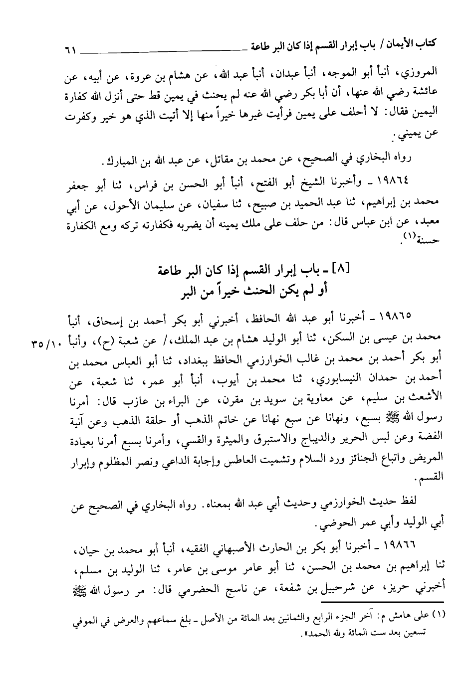 19865 - أَخْبَرَنَا أَبُو عَبْدِ اللهِ الْحَافِظُ، أَخْبَرَنِي أَبُو بَكْرٍ أَحْمَدُ بْنُ إِسْحَاقَ، أنبأ مُحَمَّدُ بْنُ عِيسَى بْنِ السَّكَنِ، ثنا أَبُو الْوَلِيدِ هِشَامُ بْنُ عَبْدِ الْمَلِكِ، عَنْ شُعْبَةَ، ح وَأنبأ أَبُو بَكْرٍ أَحْمَدُ بْنُ مُحَمَّدِ بْنِ غَالِبٍ الْخُوَارِزْمِيُّ الْحَافِظُ بِبَغْدَادَ، ثنا أَبُو الْعَبَّاسِ مُحَمَّدُ بْنُ أَحْمَدَ بْنِ حَمْدَانَ النَّيْسَابُورِيُّ، ثنا مُحَمَّدُ بْنُ أَيُّوبَ، أنبأ أَبُو عُمَرَ، ثنا شُعْبَةُ، عَنِ الْأَشْعَثِ بْنِ سُلَيْمٍ، عَنْ مُعَاوِيَةَ بْنِ سُوَيْدِ بْنِ مُقَرِّنٍ، عَنِ الْبَرَاءِ بْنِ عَازِبٍ، قَالَ: §" أَمَرَنَا رَسُولُ اللهِ صَلَّى اللهُ عَلَيْهِ وَسَلَّمَ بِسَبْعٍ , وَنَهَانَا عَنْ سَبْعٍ , نَهَانَا عَنْ خَاتَمِ الذَّهَبِ، أَوْ حَلْقَةِ الذَّهَبِ، وَعَنْ آنِيَةِ الْفِضَّةِ، وَعَنْ لِبْسِ الْحَرِيرِ، وَالدِّيبَاجِ، وَالْإِسْتَبْرَقِ، وَالْمِيثَرَةِ، وَالْقَسِّيِّ، وَأَمَرَنَا بِسَبْعٍ، أَمَرَنَا بِعِيَادَةِ الْمَرِيضِ، وَاتِّبَاعِ الْجَنَائِزِ، وَرَدِّ السَّلَامِ، وَتَشْمِيتِ الْعَاطِسِ، وَإِجَابَةِ الدَّاعِي، وَنَصْرِ الْمَظْلُومِ، وَإِبْرَارِ الْقَسَمِ ". لَفْظُ حَدِيثِ الْخُوَارِزْمِيِّ، وَحَدِيثِ أَبِي عَبْدِ اللهِ بِمَعْنَاهُ، رَوَاهُ الْبُخَارِيُّ فِي الصَّحِيحِ، عَنْ أَبِي الْوَلِيدِ، وَأَبِي عُمَرَ الْحَوْضِيِّ