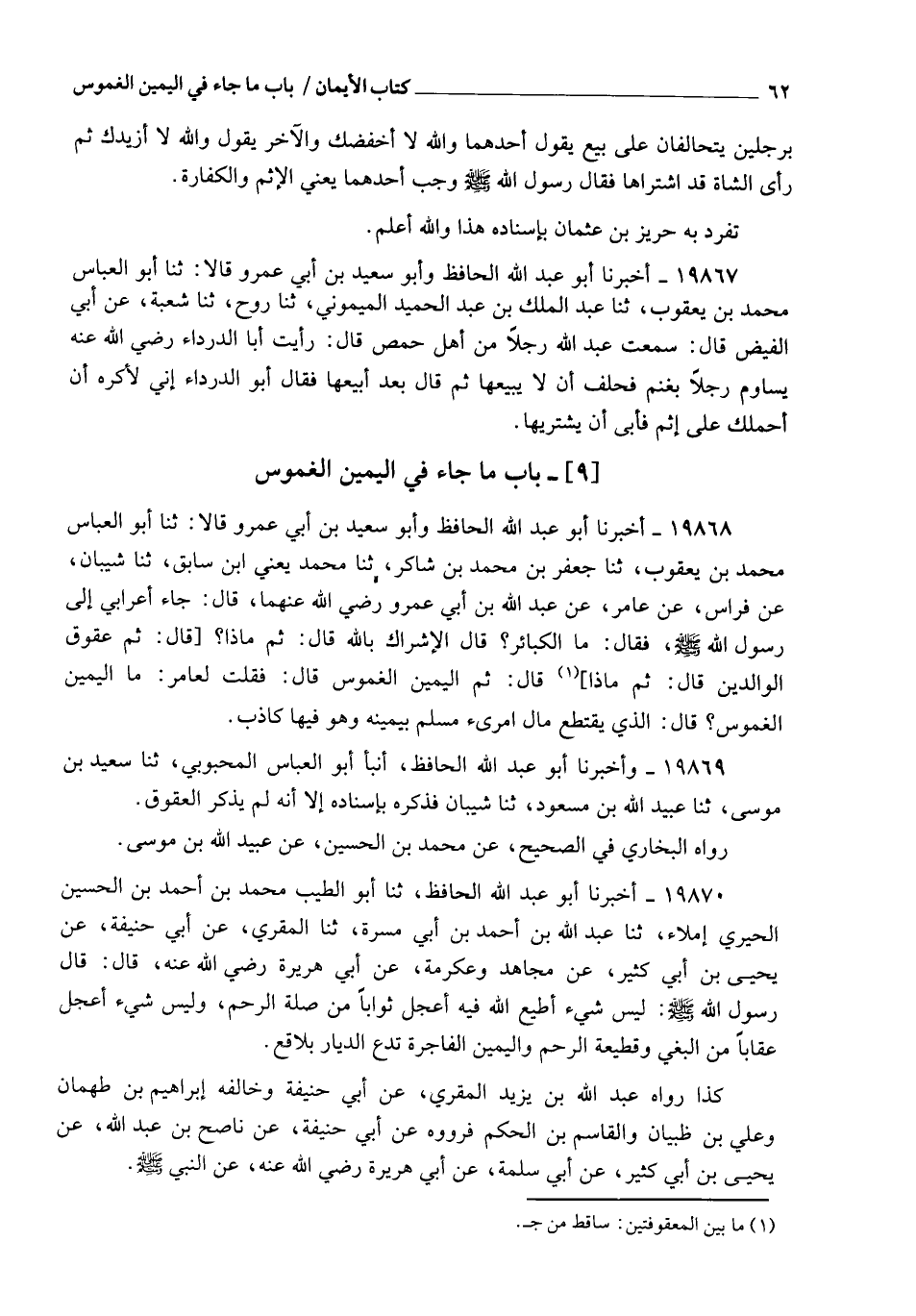 19867 - أَخْبَرَنَا أَبُو عَبْدِ اللهِ الْحَافِظُ، وَأَبُو سَعِيدِ بْنُ أَبِي عَمْرٍو، قَالَا: ثنا أَبُو الْعَبَّاسِ مُحَمَّدُ بْنُ يَعْقُوبَ، ثنا عَبْدُ الْمَلِكِ بْنُ عَبْدِ الْحَمِيدِ الْمَيْمُونِيُّ، ثنا رَوْحٌ، ثنا شُعْبَةُ، عَنْ أَبِي الْفَيْضِ، قَالَ: سَمِعْتُ عَبْدَ اللهِ رَجُلًا مِنْ أَهْلِ حِمْصَ، قَالَ: رَأَيْتُ أَبَا الدَّرْدَاءِ رَضِيَ اللهُ عَنْهُ يُسَاوِمُ رَجُلًا بِغَنَمٍ , فَحَلَفَ أَنْ لَا يَبِيعَهَا , ثُمَّ قَالَ بَعْدُ: أَبِيعُهَا، فَقَالَ أَبُو الدَّرْدَاءِ: §" إِنِّي لَأكْرَهُ أَنْ أَحْمِلَكَ عَلَى إِثْمٍ، فَأَبَى أَنْ يَشْتَرِيَهَا "