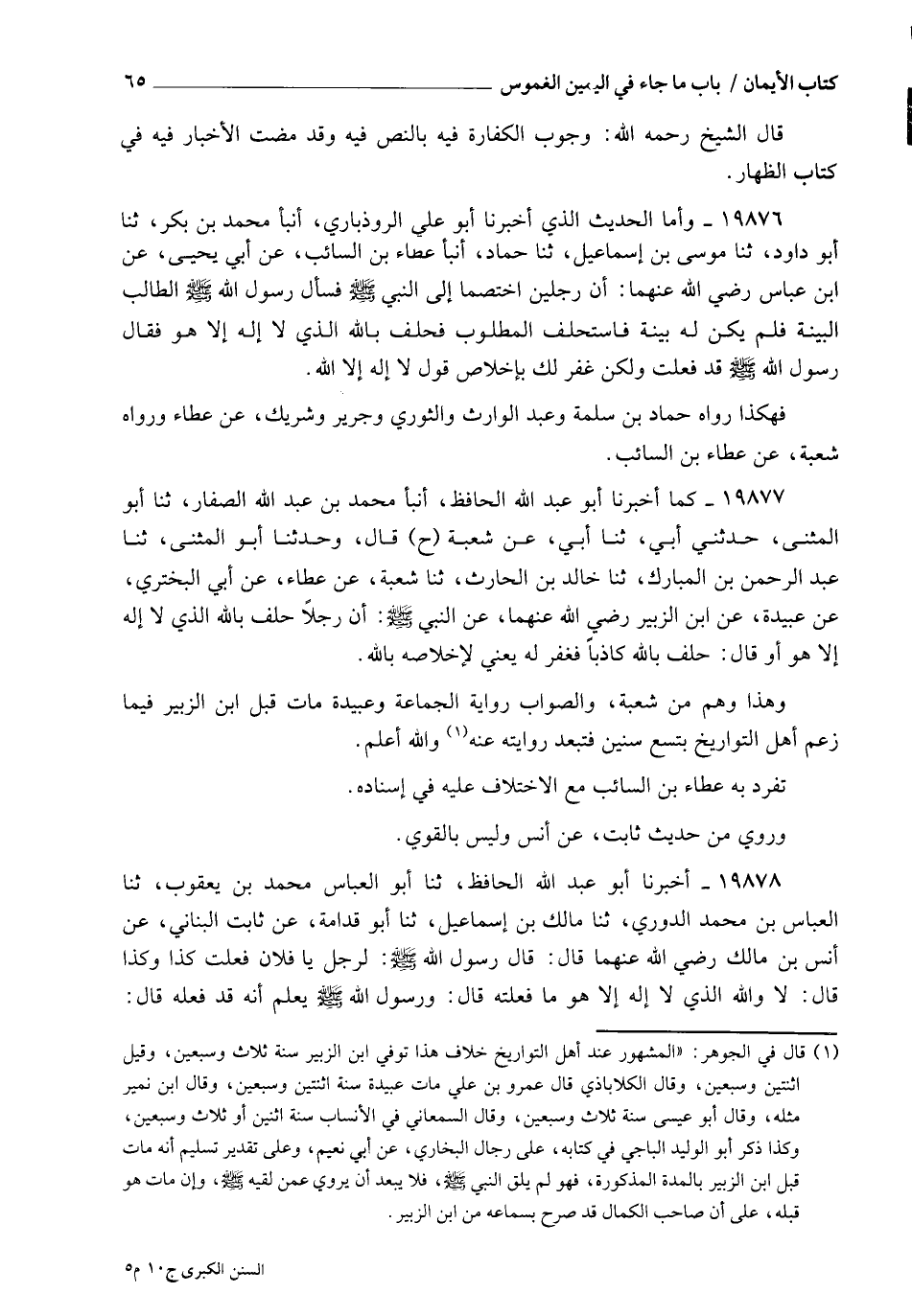 19877 - كَمَا أَخْبَرَنَا أَبُو عَبْدِ اللهِ الْحَافِظُ، أنبأ مُحَمَّدُ بْنُ عَبْدِ اللهِ الصَّفَّارُ، ثنا أَبُو الْمُثَنَّى، حَدَّثَنِي أَبِي، ثنا أَبِي، عَنْ شُعْبَةَ، ح قَالَ وَحَدَّثَنَا أَبُو الْمُثَنَّى، ثنا عَبْدُ الرَّحْمَنِ بْنُ الْمُبَارَكِ، ثنا خَالِدُ بْنُ الْحَارِثِ، ثنا شُعْبَةُ، عَنْ عَطَاءٍ، عَنْ أَبِي الْبَخْتَرِيِّ، عَنْ عُبَيْدَةَ، عَنِ ابْنِ الزُّبَيْرِ رَضِيَ اللهُ عَنْهُمَا، عَنِ النَّبِيِّ صَلَّى اللهُ عَلَيْهِ وَسَلَّمَ: " أَنَّ §رَجُلًا حَلَفَ بِاللهِ الَّذِي لَا إِلَهَ إِلَّا هُوَ - أَوْ قَالَ: حَلَفَ بِاللهِ كَاذِبًا , فَغُفِرَ لَهُ - يَعْنِي لِإِخْلَاصِهِ بِاللهِ "، وَهَذَا وَهْمٌ مِنْ شُعْبَةَ وَالصَّوَابُ، رِوَايَةُ الْجَمَاعَةِ، وَعُبَيْدَةُ مَاتَ قَبْلَ ابْنِ الزُّبَيْرِ فِيمَا زَعَمَ أَهْلُ التَّوَارِيخِ بِتِسْعِ سِنِينَ، فَتَبْعُدُ رِوَايَتُهُ عَنْهُ , وَاللهُ أَعْلَمُ، تَفَرَّدَ بِهِ عَطَاءُ بْنُ السَّائِبِ مَعَ الِاخْتِلَافِ عَلَيْهِ فِي إِسْنَادِهِ، وَرُوِيَ مِنْ حَدِيثِ ثَابِتٍ عَنْ أَنَسٍ وَلَيْسَ بِالْقَوِيِّ