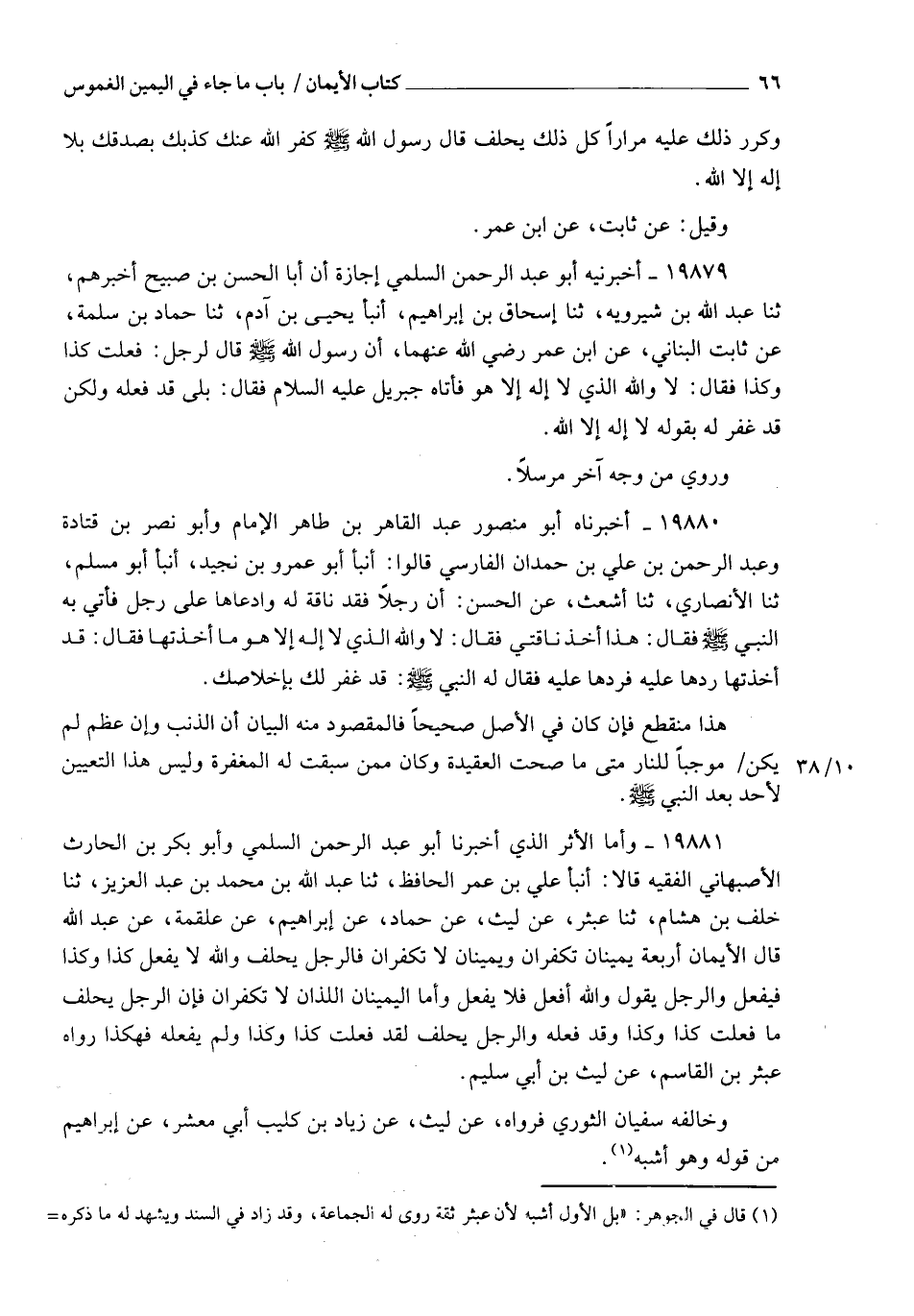 19881 - وَأَمَّا الْأَثَرُ الَّذِي أَخْبَرَنَا أَبُو عَبْدِ الرَّحْمَنِ السُّلَمِيُّ، وَأَبُو بَكْرِ بْنُ الْحَارِثِ الْأَصْبَهَانِيُّ الْفَقِيهُ، قَالَا: أنبأ عَلِيُّ بْنُ عُمَرَ الْحَافِظُ، ثنا عَبْدُ اللهِ بْنُ مُحَمَّدِ بْنِ عَبْدِ الْعَزِيزِ، ثنا خَلَفُ بْنُ هِشَامٍ، ثنا عَبْثَرٌ، عَنْ لَيْثٍ، عَنْ حَمَّادٍ، عَنْ إِبْرَاهِيمَ، عَنْ عَلْقَمَةَ، عَنْ عَبْدِ اللهِ: قَالَ: §الْأَيْمَانُ أَرْبَعَةٌ: يَمِيَنَانِ تُكَفَّرَانِ، وَيَمِينَانِ لَا تُكَفَّرَانِ، فَالرَّجُلُ يَحْلِفُ: وَاللهِ لَا يَفْعَلُ كَذَا وَكَذَا , فَيَفْعَلُ، وَالرَّجُلُ يَقُولُ: وَاللهِ أَفْعَلُ، فَلَا يَفْعَلُ، وَأَمَّا الْيَمِينَانِ اللَّذَانِ لَا تُكَفَّرَانِ: فَإِنَّ الرَّجُلَ يَحْلِفُ: مَا فَعَلْتُ كَذَا وَكَذَا، وَقَدْ فَعَلَهُ، وَالرَّجُلُ يَحْلِفُ: لَقَدْ فَعَلْتُ كَذَا وَكَذَا، وَلَمْ يَفْعَلْهُ ". فَهَكَذَا رَوَاهُ عَبْثَرُ بْنُ الْقَاسِمِ، عَنْ لَيْثِ بْنِ أَبِي سُلَيْمٍ، وَخَالَفَهُ سُفْيَانُ الثَّوْرِيُّ، فَرَوَاهُ عَنْ لَيْثٍ، عَنْ زِيَادِ بْنِ كُلَيْبٍ أَبِي مَعْشَرٍ، عَنْ إِبْرَاهِيمَ مِنْ قَوْلِهِ , وَهُوَ أَشْبَهُ