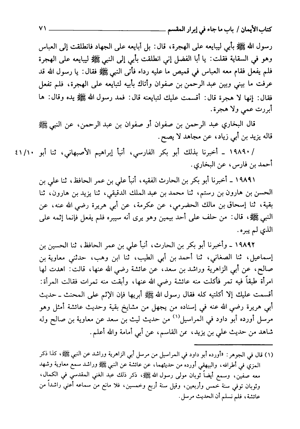 19892 - وَأَخْبَرَنَا أَبُو بَكْرِ بْنُ الْحَارِثِ، أنبأ عَلِيُّ بْنُ عُمَرَ الْحَافِظُ، ثنا الْحُسَيْنُ بْنُ إِسْمَاعِيلَ، ثنا الصَّغَانِيُّ، ثنا أَحْمَدُ بْنُ أَبِي الطَّيِّبِ، ثنا ابْنُ وَهْبٍ، حَدَّثَنِي مُعَاوِيَةُ بْنُ صَالِحٍ، عَنْ أَبِي الزَّاهِرِيَّةِ، وَرَاشِدِ بْنِ سَعْدٍ، عَنْ عَائِشَةَ رَضِيَ اللهُ عَنْهَا، قَالَتْ: أَهْدَتْ لَهَا امْرَأَةٌ طَبَقًا فِيهِ تَمْرٌ، فَأَكَلَتْ مِنْهُ عَائِشَةُ رَضِيَ اللهُ عَنْهَا، وَأَبْقَتْ مِنْهُ تَمَرَاتٍ، فَقَالَتِ الْمَرْأَةُ: أَقْسَمْتُ عَلَيْكِ إِلَّا أَكَلْتِيهِ كُلَّهُ، فَقَالَ رَسُولُ اللهِ صَلَّى اللهُ عَلَيْهِ وَسَلَّمَ: " §أَبِرِّيهَا فَإِنَّ الْإِثْمَ عَلَى الْمُحَنِّثِ "، حَدِيثُ أَبِي هُرَيْرَةَ رَضِيَ اللهُ عَنْهُ فِي إِسْنَادِهِ مَنْ يُجْهَلُ مِنْ مَشَايِخِ بَقِيَّةَ، وَحَدِيثُ عَائِشَةَ أَمْثَلُ، وَهُوَ مُرْسَلٌ، أَورَدَهُ أَبُو دَاوُدَ فِي الْمَرَاسِيلِ مِنْ حَدِيثِ لَيْثِ بْنِ سَعْدٍ، عَنْ مُعَاوِيَةَ بْنِ صَالِحٍ وَلَهُ شَاهِدٌ مِنْ حَدِيثِ عَلِيِّ بْنِ يَزِيدَ، عَنِ الْقَاسِمِ، عَنْ أَبِي أُمَامَةَ وَاللهُ أَعْلَمُ، -[72]- وَرُوِّينَا عَنِ الْقَاسِمِ بْنِ مُحَمَّدٍ , وَمَكْحُولٍ , وَالْحَكَمِ بْنِ عُتَيْبَةَ: " أَنَّ الْكَفَّارَةَ عَلَى الْمُقْسِمِ "