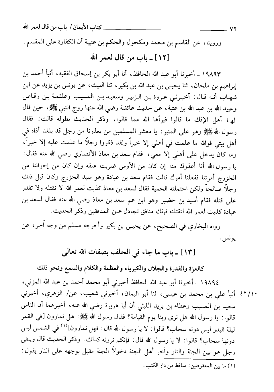 19894 - أَخْبَرَنَا أَبُو عَبْدِ اللهِ الْحَافِظُ، أَخْبَرَنِي أَبُو مُحَمَّدٍ أَحْمَدُ بْنُ عَبْدِ اللهِ الْمُزَنِيُّ، أنبأ عَلِيُّ بْنُ مُحَمَّدِ بْنِ عِيسَى، ثنا أَبُو الْيَمَانِ، أَخْبَرَنِي شُعَيْبٌ، عَنِ الزُّهْرِيِّ، أَخْبَرَنِي سَعِيدُ بْنُ الْمُسَيِّبِ، وَعَطَاءُ بْنُ يَزِيدَ اللَّيْثِيُّ، أَنَّ أَبَا هُرَيْرَةَ رَضِيَ اللهُ عَنْهُ أَخْبَرَهُمَا، أَنَّ النَّاسَ قَالُوا: يَا رَسُولَ اللهِ §هَلْ نَرَى رَبَّنَا يَوْمَ الْقِيَامَةِ؟ فَقَالَ رَسُولُ اللهِ صَلَّى اللهُ عَلَيْهِ وَسَلَّمَ: " هَلْ تُمَارُونَ فِي الْقَمَرِ لَيْلَةَ الْبَدْرِ لَيْسَ دُونَهُ سَحَابٌ "؟ قَالُوا: لَا , يَا رَسُولَ اللهِ، قَالَ: " فَهَلْ تُمَارُونَ فِي الشَّمْسِ لَيْسَ دُونَهَا سَحَابٌ "؟ قَالُوا: لَا , يَا رَسُولَ اللهِ، قَالَ: " فَإِنَّكُمْ تَرَوْنَهُ كَذَلِكَ " وَذَكَرَ الْحَدِيثَ , قَالَ: " وَيَبْقَى رَجُلٌ هُوَ بَيْنَ الْجَنَّةِ وَالنَّارِ، وَآخَرُ أَهْلِ الْجَنَّةِ دُخُولًا الْجَنَّةَ مُقْبِلٌ بِوَجْهِهِ عَلَى النَّارِ , يَقُولُ: -[73]- يَا رَبِّ اصْرِفْ وَجْهِيَ عَنِ النَّارِ، فَإِنَّهُ قَدْ قَشَبَنِي رِيحُهَا، وَأَحْرَقَنِي ذَكَاؤُهَا، فَيَقُولُ اللهُ عَزَّ وَجَلَّ " فَهَلْ عَسَيْتَ إِنْ فَعَلْتُ ذَلِكَ بِكَ أَنْ تَسْأَلَ غَيْرَ ذَلِكَ "؟ فَيَقُولُ: لَا , وَعِزَّتِكَ، فَيُعْطِي رَبَّهُ مَا شَاءَ مِنْ عَهْدٍ وَمِيثَاقٍ، فَيَصْرِفُ اللهُ وَجْهَهُ عَنِ النَّارِ، فَإِذَا أَقْبَلَ بِوَجْهِهِ عَلَى الْجَنَّةِ، فَرَأَى بَهْجَتَهَا، فَيَسْكُتُ مَا شَاءَ اللهُ أَنْ يَسْكُتَ , ثُمَّ يَقُولُ: يَا رَبِّ , قَدِّمْنِي عِنْدَ بَابِ الْجَنَّةِ، فَيَقُولُ اللهُ: " أَلَسْتَ قَدْ أَعْطَيْتَ الْعُهُودَ وَالْمَوَاثِيقَ أَنْ لَا تَسْأَلَ غَيْرَ الَّذِي كُنْتَ سَأَلْتَ "؟ فَيَقُولُ: يَا رَبِّ , لَا أَكُونُ أَشْقَى خَلْقِكَ فَيَقُولُ: " هَلْ عَسَيْتَ إِنْ أُعْطِيتَ ذَلِكَ أَنْ تَسْأَلَ غَيْرَهُ؟ "، فَيَقُولُ: لَا , وَعِزَّتِكَ لَا أَسْأَلُكَ غَيْرَ ذَلِكَ , وَذَكَرَ الْحَدِيثَ , إِلَى أَنْ، قَالَ: , ثُمَّ يَأْذَنُ لَهُ فِي دُخُولِ الْجَنَّةِ، فَيَقُولُ لَهُ: تَمَنَّ , فَيَتَمَنَّى "، حَتَّى إِذَا انْقَطَعَ بِهِ قَالَ اللهُ تَبَارَكَ وَتَعَالَى: " مِنْ كَذَا وَكَذَا , فَسَلْ " يُذَكِّرُهُ رَبُّهُ , حَتَّى إِذَا انْتَهَتْ بِهِ الْأَمَانِيُّ، قَالَ اللهُ: " لَكَ ذَلِكَ , وَمِثْلُهُ مَعَهُ "، قَالَ أَبُو سَعِيدٍ الْخُدْرِيُّ، لِأَبِي هُرَيْرَةَ رَضِيَ اللهُ عَنْهُ: إِنَّ رَسُولَ اللهِ صَلَّى اللهُ عَلَيْهِ وَسَلَّمَ قَالَ: " لَكَ ذَلِكَ , وَعَشَرَةُ أَمْثَالِهِ ". رَوَاهُ الْبُخَارِيُّ فِي الصَّحِيحِ، عَنْ أَبِي الْيَمَانِ، وَرَوَاهُ مُسْلِمٌ، عَنْ عَبْدِ اللهِ بْنِ عَبْدِ الرَّحْمَنِ، عَنْ أَبِي الْيَمَانِ، قَالَ الْبُخَارِيُّ، وَقَالَ أَيُّوبُ النَّبِيُّ صَلَّى اللهُ عَلَيْهِ وَسَلَّمَ: " وَعِزَّتِكَ , لَا غِنًى بِي عَنْ بَرَكَتِكَ " وَفِي حَدِيثِ قَتَادَةَ، عَنْ أَنَسِ بْنِ مَالِكٍ عَنِ النَّبِيِّ صَلَّى اللهُ عَلَيْهِ وَسَلَّمَ فِي قِصَّةِ جَهَنَّمَ، فَتَقُولُ: " قَطْ قَطْ , وَعِزَّتِكَ " قَالَ الشَّيْخُ: وَفِي حَدِيثِ أَنَسِ بْنِ مَالِكٍ، عَنِ النَّبِيِّ صَلَّى اللهُ عَلَيْهِ وَسَلَّمَ فِي الَّذِي يُغْمَسُ فِي الْجَنَّةِ: " فَيُقَالُ لَهُ: هَلْ رَأَيْتَ بُؤْسًا قَطُّ، يَقُولُ: " لَا وَعِزَّتِكَ وَجَلَالِكَ "