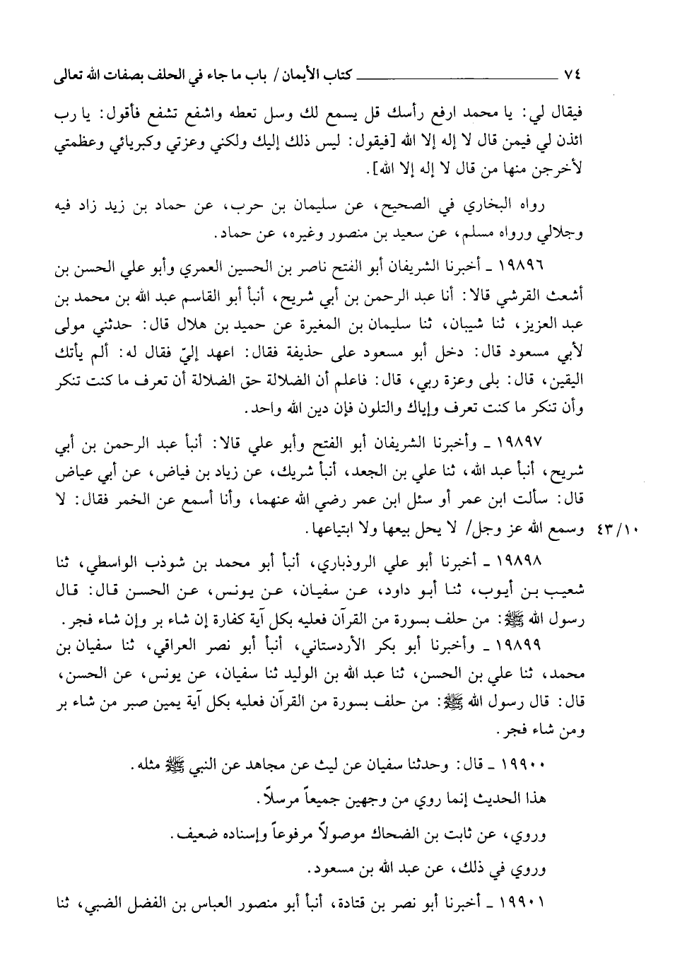 19901 - أَخْبَرَنَا أَبُو نَصْرِ بْنُ قَتَادَةَ، أنبأ أَبُو مَنْصُورٍ الْعَبَّاسُ بْنُ الْفَضْلِ الضَّبِّيُّ، ثنا -[75]- أَحْمَدُ بْنُ نَجْدَةَ، ثنا سَعِيدُ بْنُ مَنْصُورٍ، ثنا إِسْمَاعِيلُ بْنُ زَكَرِيَّا، عَنِ الْأَعْمَشِ، عَنْ عَبْدِ اللهِ بْنِ مُرَّةَ، عَنْ أَبِي كَنَفٍ قَالَ: بَيْنَمَا أَنَا أَمْشِي مَعَ ابْنِ مَسْعُودٍ رَضِيَ اللهُ عَنْهُ فِي سُوقِ الدَّقِيقِ , إِذْ سَمِعَ رَجُلًا يَحْلِفُ بِسُورَةِ الْبَقَرَةِ، فَقَالَ ابْنُ مَسْعُودٍ: إِنَّ عَلَيْهِ لِكُلِّ آيَةٍ مِنْهَا يَمِينًا، قَالَ الْأَعْمَشُ: فَذَكَرْتُ ذَلِكَ لِإِبْرَاهِيمَ فَقَالَ: قَالَ عَبْدُ اللهِ: " §مَنْ حَلَفَ بِالْقُرْآنِ فَعَلَيْهِ بِكُلِّ آيَةٍ يَمِينٌ، وَمَنْ كَفَرَ بِآيَةٍ مِنَ الْقُرْآنِ فَقَدْ كَفَرَ بِهِ كُلِّهِ "