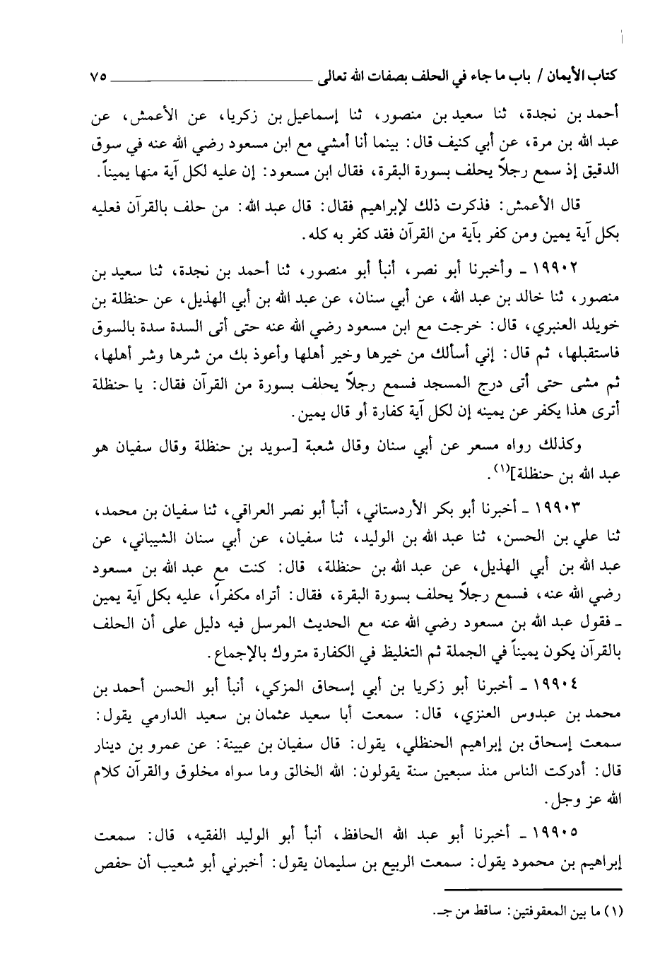19902 - وَأَخْبَرَنَا أَبُو نَصْرٍ، أنبأ أَبُو مَنْصُورٍ، ثنا أَحْمَدُ بْنُ نَجْدَةَ، ثنا سَعِيدُ بْنُ مَنْصُورٍ، ثنا خَالِدُ بْنُ عَبْدِ اللهِ، عَنْ أَبِي سِنَانٍ، عَنْ عَبْدِ اللهِ بْنِ أَبِي الْهُذَيْلِ، عَنْ حَنْظَلَةَ بْنِ خُوَيْلِدٍ الْعَنْبَرِيِّ، قَالَ: خَرَجْتُ مَعَ ابْنِ مَسْعُودٍ رَضِيَ اللهُ عَنْهُ حَتَّى أَتَى السُّدَّةَ - سُدَّةً بِالسُّوقِ - فَاسْتَقْبَلَهَا , ثُمَّ قَالَ: " إِنِّي أَسْأَلُكَ مِنْ خَيْرِهَا، وَخَيْرِ أَهْلِهَا، وَأَعُوذُ بِكَ مِنْ شَرِّهَا، وَشَرِّ أَهْلِهَا " , ثُمَّ مَشَى حَتَّى أَتَى دَرَجَ الْمَسْجِدِ، فَسَمِعَ رَجُلًا يَحْلِفُ بِسُورَةٍ مِنَ الْقُرْآنِ، فَقَالَ: " يَا حَنْظَلَةُ §أَتَرَى هَذَا يُكَفِّرُ عَنْ يَمِينِهِ، إِنَّ كُلَّ آيَةٍ كَفَّارَةٌ، أَوْ قَالَ: يَمِينٌ "، وَكَذَلِكَ رَوَاهُ مِسْعَرٌ، عَنْ أَبِي سِنَانٍ، وَقَالَ شُعْبَةُ: سُوَيْدُ بْنُ حَنْظَلَةَ، وَقَالَ سُفْيَانُ: هُوَ عَبْدُ اللهِ بْنُ حَنْظَلَةَ