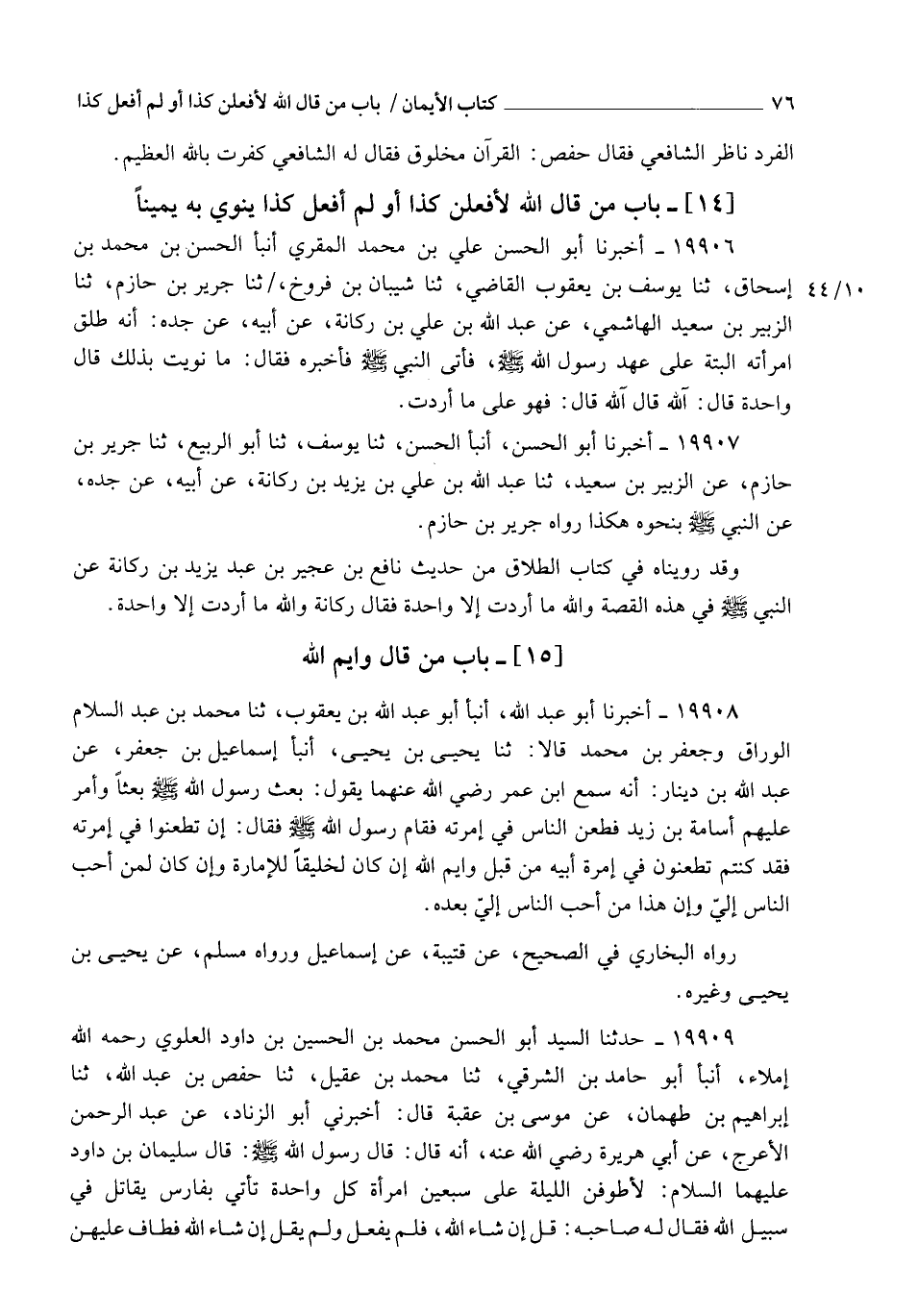 19909 - حَدَّثَنَا السَّيِّدُ أَبُو الْحَسَنِ مُحَمَّدُ بْنُ الْحُسَيْنِ بْنِ دَاوُدَ الْعَلَوِيُّ رَحِمَهُ اللهُ إِمْلَاءً، أنبأ أَبُو حَامِدِ بْنُ الشَّرْقِيِّ، ثنا مُحَمَّدُ بْنُ عَقِيلٍ، ثنا حَفْصُ بْنُ عَبْدِ اللهِ، ثنا إِبْرَاهِيمُ بْنِ طَهْمَانَ، عَنْ مُوسَى بْنِ عُقْبَةَ، قَالَ: أَخْبَرَنِي أَبُو الزِّنَادِ، عَنْ عَبْدِ الرَّحْمَنِ الْأَعْرَجِ، عَنْ أَبِي هُرَيْرَةَ رَضِيَ اللهُ عَنْهُ أَنَّهُ قَالَ: قَالَ رَسُولُ اللهِ صَلَّى اللهُ عَلَيْهِ وَسَلَّمَ: قَالَ سُلَيْمَانُ بْنُ دَاوُدَ عَلَيْهِمَا السَّلَامُ، §" لَأَطُوفَنَّ اللَّيْلَةَ عَلَى سَبْعِينَ امْرَأَةً , كُلُّ وَاحِدَةٍ تَأْتِي بِفَارِسٍ يُقَاتِلُ فِي سَبِيلِ اللهِ "، فَقَالَ لَهُ صَاحِبُهُ: قُلْ إِنْ شَاءَ اللهُ، فَلَمْ يَفْعَلْ، وَلَمْ يَقُلْ: إِنْ شَاءَ اللهُ، فَطَافَ عَلَيْهِنَّ -[77]- جَمِيعًا، فَلَمْ تَحْمِلْ مِنْهُنَّ إِلَّا امْرَأَةٌ وَاحِدَةٌ جَاءَتْ بِشِقِّ رَجُلٍ، " وَايْمُ الَّذِي نَفْسُ مُحَمَّدٍ بِيَدِهِ , لَوْ قَالَ: إِنْ شَاءَ اللهُ , لَجَاهَدُوا فِي سَبِيلِ اللهِ أَجْمَعُونَ ". أَخْرَجَهُ مُسْلِمٌ فِي الصَّحِيحِ مِنْ وَجْهٍ آخَرَ، عَنْ مُوسَى بْنِ عُقْبَةَ، وَأَخْرَجَهُ الْبُخَارِيُّ مِنْ وَجْهٍ آخَرَ، عَنْ أَبِي الزِّنَادِ، وَرُوِّينَا فِي حَدِيثِ أَبِي قَتَادَةَ، فِي قِصَّةِ السَّلْبِ قَوْلَ أَبِي بَكْرٍ الصِّدِّيقِ رَضِيَ اللهُ عَنْهُ، عِنْدَ النَّبِيِّ صَلَّى اللهُ عَلَيْهِ وَسَلَّمَ: " لَاهَا اللهِ إِذًا "