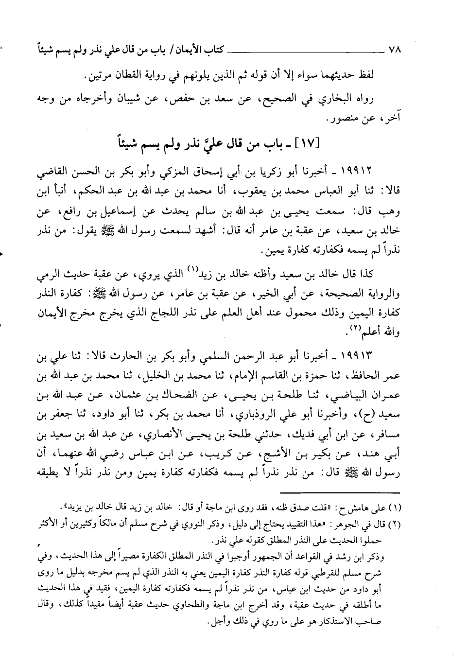 19912 - أَخْبَرَنَا أَبُو زَكَرِيَّا بْنُ أَبِي إِسْحَاقَ الْمُزَكِّي، وَأَبُو بَكْرِ بْنُ الْحَسَنِ الْقَاضِي، قَالَا: ثنا أَبُو الْعَبَّاسِ مُحَمَّدُ بْنُ يَعْقُوبَ، أنا مُحَمَّدُ بْنُ عَبْدِ اللهِ بْنِ عَبْدِ الْحَكَمِ، أنبأ ابْنُ وَهْبٍ، قَالَ: سَمِعْتُ يَحْيَى بْنَ عَبْدِ اللهِ بْنِ سَالِمٍ يُحَدِّثُ، عَنْ إِسْمَاعِيلَ بْنِ رَافِعٍ، عَنْ خَالِدِ بْنِ يَزِيدَ، عَنْ عُقْبَةَ بْنِ عَامِرٍ، أَنَّهُ قَالَ: أَشْهَدُ , لَسَمِعْتُ رَسُولَ اللهِ صَلَّى اللهُ عَلَيْهِ وَسَلَّمَ يَقُولُ: §" مَنْ نَذَرَ نَذْرًا لَمْ يُسَمِّهِ , فَكَفَّارَتُهُ كَفَّارَةُ يَمِينٍ ". كَذَا، قَالَ خَالِدُ بْنُ سَعِيدٍ، وَأَظُنُّهُ خَالِدَ بْنَ زَيْدٍ، الَّذِي يَرْوِي عَنْ عُقْبَةَ حَدِيثَ الرَّمْيِ وَالرِّوَايَةُ الصَّحِيحَةُ: