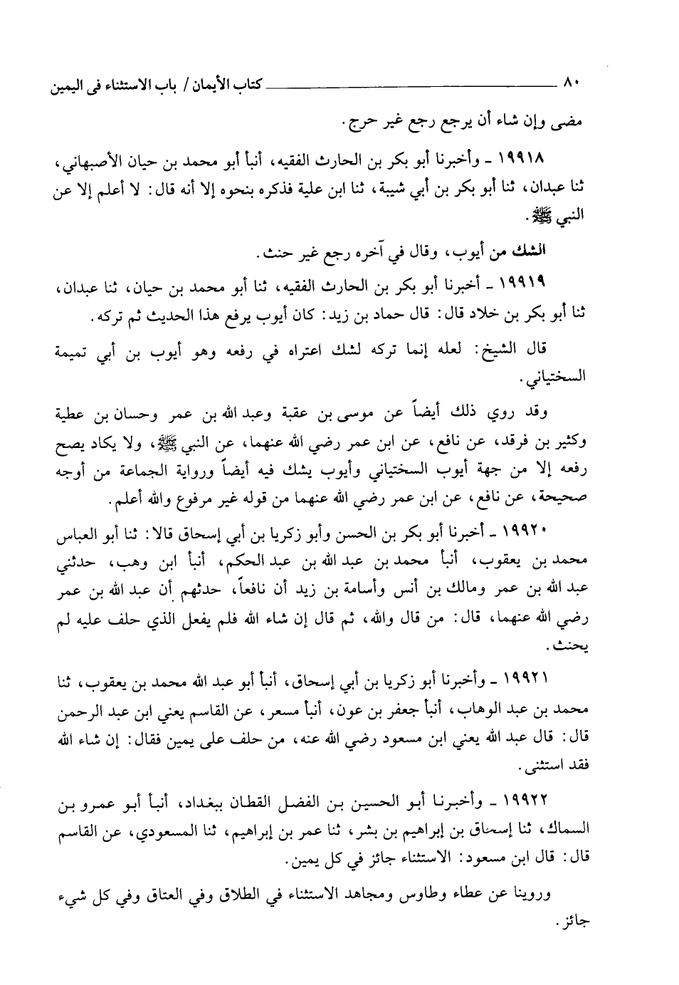 19922 - وَأَخْبَرَنَا أَبُو الْحُسَيْنِ بْنُ الْفَضْلِ الْقَطَّانُ بِبَغْدَادَ، أنبأ أَبُو عَمْرِو بْنُ السَّمَّاكِ، ثنا إِسْحَاقُ بْنُ إِبْرَاهِيمَ بْنِ بِشْرٍ، ثنا عُمَرُ بْنُ إِبْرَاهِيمَ، ثنا الْمَسْعُودِيُّ، عَنِ الْقَاسِمِ قَالَ: قَالَ ابْنُ مَسْعُودٍ: §" الِاسْتِثْنَاءُ جَائِزٌ فِي كُلِّ يَمِينٍ "