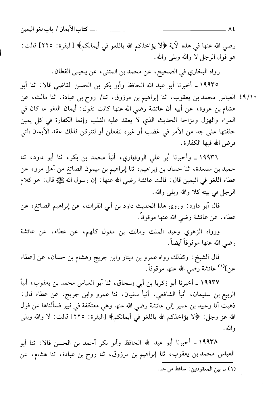 19935 - أَخْبَرَنَا أَبُو عَبْدِ اللهِ الْحَافِظُ، وَأَبُو بَكْرِ بْنُ الْحَسَنِ الْقَاضِي، قَالَا: ثنا أَبُو الْعَبَّاسِ مُحَمَّدُ بْنُ يَعْقُوبَ، ثنا إِبْرَاهِيمُ بْنُ مَرْزُوقٍ، ثنا رَوْحُ بْنُ عُبَادَةَ، ثنا مَالِكٌ، عَنْ هِشَامِ بْنِ عُرْوَةَ، عَنْ أَبِيهِ، أَنَّ عَائِشَةَ رَضِيَ اللهُ عَنْهَا كَانَتْ تَقُولُ: §" أَيْمَانُ اللَّغْوِ مَا كَانَ فِي الْمِرَاءِ وَالْهَزْلِ وَمُزَاحَةِ الْحَدِيثِ الَّذِي لَا يَعْقِدُ عَلَيْهِ الْقَلْبُ، وَإِنَّمَا الْكَفَّارَةُ فِي كُلِّ يَمِينٍ حَلَفْتَهَا عَلَى جَدٍّ مِنَ الْأَمْرِ فِي غَضَبٍ، أَوْ غَيْرِهِ: لَتَفْعَلَنَّ، أَوْ لَتَتْرُكَنَّ، فَذَلِكَ عَقْدُ الْأَيْمَانِ الَّتِي فَرَضَ اللهُ فِيهَا الْكَفَّارَةَ "