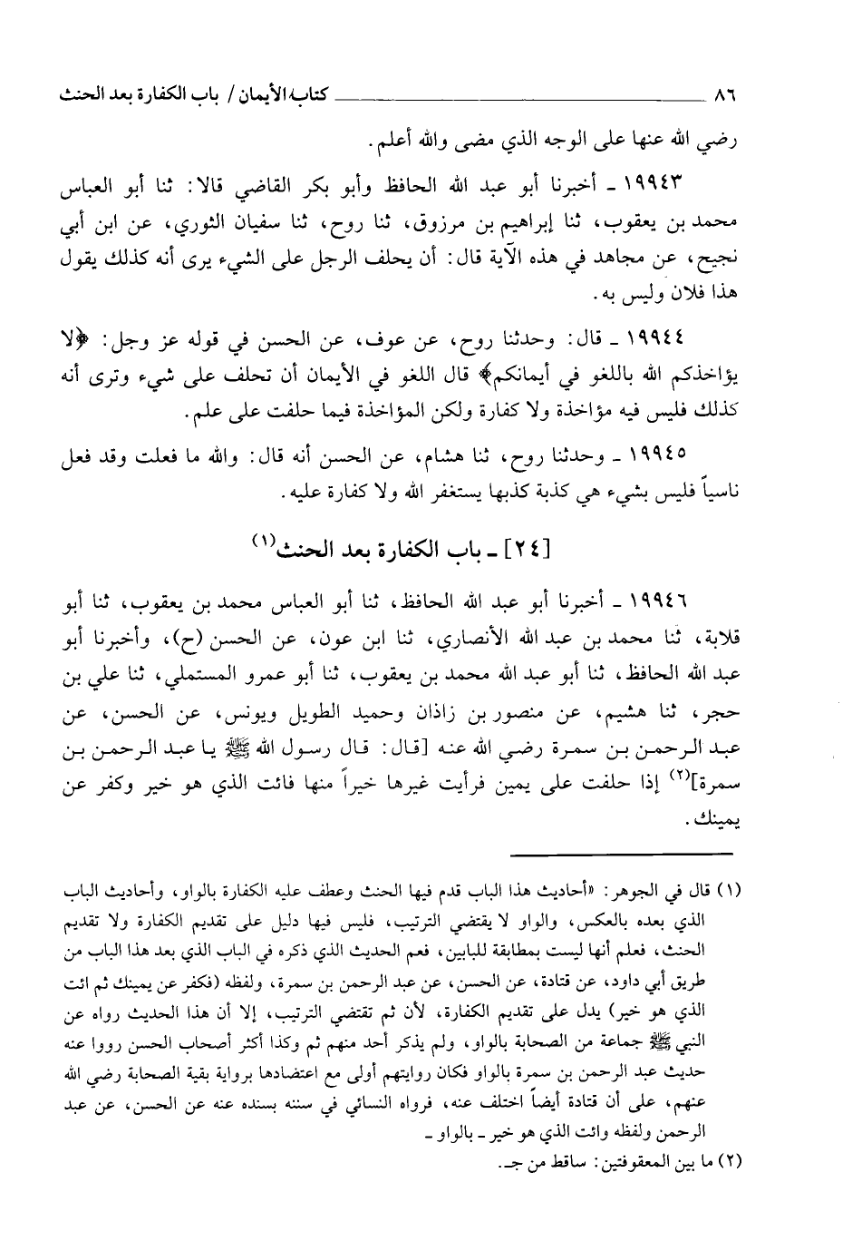19946 - أَخْبَرَنَا أَبُو عَبْدِ اللهِ الْحَافِظُ، ثنا أَبُو الْعَبَّاسِ مُحَمَّدُ بْنُ يَعْقُوبَ، ثنا أَبُو قِلَابَةَ، ثنا مُحَمَّدُ بْنُ عَبْدِ اللهِ الْأَنْصَارِيُّ، ثنا ابْنُ عَوْنٍ، عَنِ الْحَسَنِ، ح، وَأَخْبَرَنَا أَبُو عَبْدِ اللهِ الْحَافِظُ، ثنا أَبُو عَبْدِ اللهِ مُحَمَّدُ بْنُ يَعْقُوبَ، ثنا أَبُو عَمْرٍو الْمُسْتَمْلِي، ثنا عَلِيُّ بْنُ حُجْرٍ، ثنا هُشَيْمٌ، عَنْ مَنْصُورِ بْنِ زَاذَانَ، وَحُمَيْدٌ الطَّوِيلُ، وَيُونُسُ، عَنِ الْحَسَنِ، عَنْ عَبْدِ الرَّحْمَنِ بْنِ سَمُرَةَ رَضِيَ اللهُ عَنْهُ قَالَ: قَالَ رَسُولُ اللهِ صَلَّى اللهُ عَلَيْهِ وَسَلَّمَ: " يَا عَبْدَ الرَّحْمَنِ بْنَ سَمُرَةَ §إِذَا حَلَفْتَ عَلَى يَمِينٍ، فَرَأَيْتَ غَيْرَهَا خَيْرًا مِنْهَا، فَائْتِ الَّذِي هُوَ خَيْرٌ , وَكَفِّرْ عَنْ يَمِينِكَ "، -[87]- أَخْرَجَهُ الْبُخَارِيُّ فِي الصَّحِيحِ مِنْ وَجْهٍ آخَرَ عَنِ ابْنِ عَوْنٍ، وَرَوَاهُ مُسْلِمٌ عَنْ عَلِيِّ بْنِ حُجْرٍ