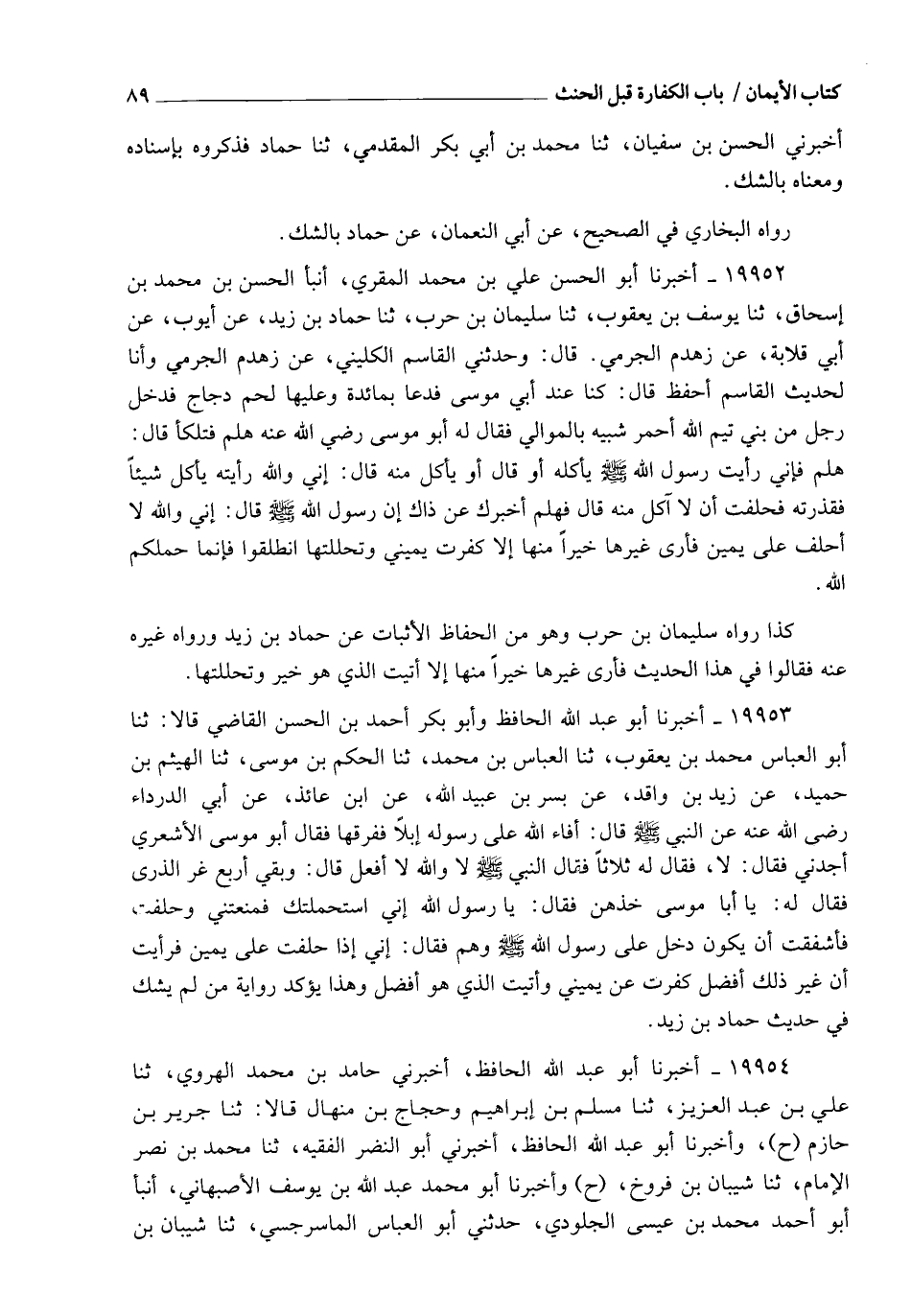 19952 - أَخْبَرَنَا أَبُو الْحَسَنِ عَلِيُّ بْنُ مُحَمَّدٍ الْمُقْرِئُ , أنبأ الْحَسَنُ بْنُ مُحَمَّدِ بْنِ إِسْحَاقَ , ثنا يُوسُفُ بْنُ يَعْقُوبَ , ثنا سُلَيْمَانُ بْنُ حَرْبٍ , ثنا حَمَّادُ بْنُ زَيْدٍ , عَنْ أَيُّوبَ , عَنْ أَبِي قِلَابَةَ , عَنْ زَهْدَمٍ الْجَرْمِيِّ قَالَ وَحَدَّثَنِي الْقَاسِمُ الْكُلِينِيُّ , عَنْ زَهْدَمٍ الْجَرْمِيِّ , وَأنا لِحَدِيثِ الْقَاسِمِ أَحْفَظُ , قَالَ: كُنَّا عِنْدَ أَبِي مُوسَى فَدَعَا بِمَائِدَةٍ , وَعَلَيْهَا لَحْمُ دَجَاجٍ , فَدَخَلَ رَجُلٌ مِنْ بَنِي تَيْمِ اللهِ أَحْمَرُ , شَبِيهٌ بِالْمَوَالِي فَقَالَ لَهُ أَبُو مُوسَى رَضِيَ اللهُ عَنْهُ: " هَلُمَّ " , فَتَلَكَّأَ , قَالَ: " هَلُمَّ , فَإِنِّي رَأَيْتُ رَسُولَ اللهِ صَلَّى اللهُ عَلَيْهِ وَسَلَّمَ يَأْكُلُهُ " أَوْ قَالَ " أَوْ يَأْكُلُ مِنْهُ " , قَالَ: " إِنِّي وَاللهِ رَأَيْتُهُ يَأْكُلُ شَيْئًا فَقَذِرْتُهُ فَحَلَفْتُ أَنْ لَا آكُلَ مِنْهُ " , قَالَ: " فَهَلُمَّ أُخْبِرْكَ عَنْ ذَاكَ: " إِنَّ رَسُولَ اللهِ صَلَّى اللهُ عَلَيْهِ وَسَلَّمَ قَالَ: §" إِنِّي وَاللهِ لَا أَحْلِفُ عَلَى يَمِينٍ فَأَرَى غَيْرَهَا خَيْرًا مِنْهَا , إِلَّا كَفَّرْتُ يَمِينِي وَتَحَلَّلْتُهَا انْطَلِقُوا , فَإِنَّمَا حَمَلَكُمُ اللهُ ". كَذَا رَوَاهُ سُلَيْمَانُ بْنُ حَرْبٍ وَهُوَ مِنَ الْحُفَّاظِ الْأَثْبَاتِ عَنْ حَمَّادِ بْنِ زَيْدٍ وَرَوَاهُ غَيْرُهُ , عَنْهُ فَقَالُوا فِي هَذَا الْحَدِيثِ: " فَأَرَى غَيْرَهَا خَيْرًا مِنْهَا , إِلَّا أَتَيْتُ الَّذِي هُوَ خَيْرٌ وَتَحَلَّلْتُهَا "