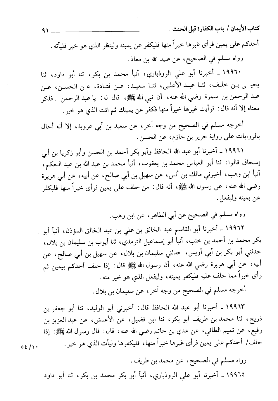 19964 - أَخْبَرَنَا أَبُو عَلِيٍّ الرُّوذْبَارِيُّ , أنبأ أَبُو بَكْرٍ مُحَمَّدُ بْنُ بَكْرٍ ثنا أَبُو دَاوُدَ -[92]- السِّجِسْتَانِيُّ قَالَ: أَحَادِيثُ أَبِي مُوسَى الْأَشْعَرِيِّ وَعَدِيِّ بْنِ حَاتِمٍ وَأَبِي هُرَيْرَةَ رَضِيَ اللهُ عَنْهُمْ قَالَ الشَّيْخُ: وَعَبْدُ الرَّحْمَنِ بْنُ سَمُرَةَ رَوَى حَدِيثَ كُلِّ وَاحِدٍ مِنْهُمْ مَا دَلَّ عَلَى الْحِنْثِ قَبْلَ الْكَفَّارَةِ , وَبَعْضُهَا مَا دَلَّ عَلَى الْكَفَّارَةِ بَعْدَ الْحِنْثِ , وَأَكْثَرُهَا قَالُوا: " فَلْيُكَفِّرْ يَمِينَهُ , وَلْيَأْتِ الَّذِي هُوَ خَيْرٌ ". قَالَ الشَّيْخُ رَحِمَهُ اللهُ: وَاحْتِجَاجُ الشَّافِعِيِّ رَحِمَهُ اللهُ فِي هَذِهِ الْمَسْأَلَةِ بِمَا