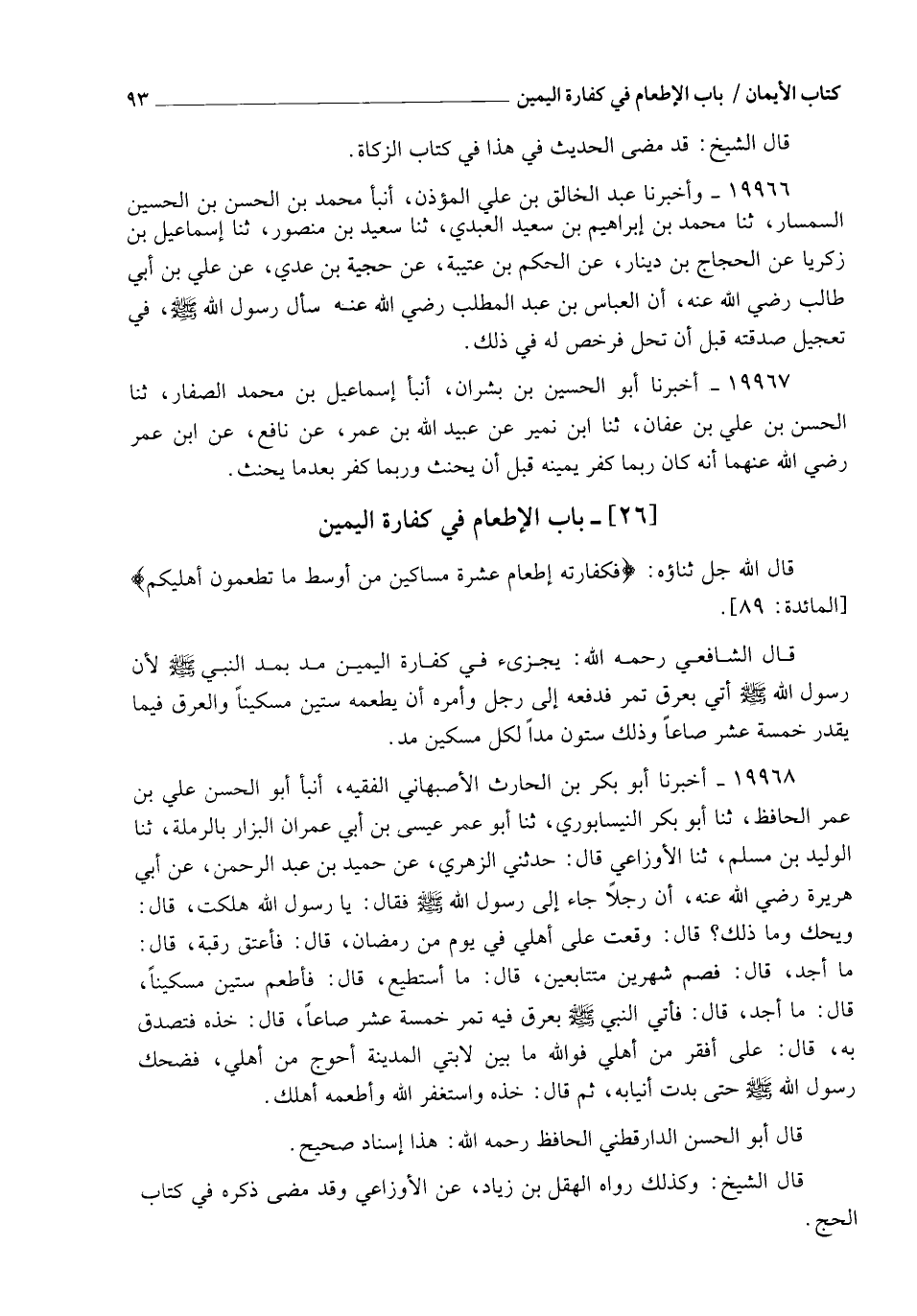 19968 - أَخْبَرَنَا أَبُو بَكْرِ بْنُ الْحَارِثِ الْأَصْبَهَانِيُّ الْفَقِيهُ , أنبأ أَبُو الْحَسَنِ عَلِيُّ بْنُ عُمَرَ الْحَافِظُ , ثنا أَبُو بَكْرٍ النَّيْسَابُورِيُّ , ثنا أَبُو عُمَرَ عِيسَى بْنُ أَبِي عِمْرَانَ الْبَزَّارُ بِالرَّمْلَةِ ثنا الْوَلِيدُ بْنُ مُسْلِمٍ , ثنا الْأَوْزَاعِيُّ قَالَ: حَدَّثَنَي الزُّهْرِيُّ , عَنْ حُمَيْدِ بْنِ عَبْدِ الرَّحْمَنِ , عَنْ أَبِي هُرَيْرَةَ رَضِيَ اللهُ عَنْهُ , §أَنَّ رَجُلًا جَاءَ إِلَى رَسُولِ اللهِ صَلَّى اللهُ عَلَيْهِ وَسَلَّمَ , فَقَالَ: " يَا رَسُولَ اللهِ , هَلَكْتُ " , قَالَ: " وَيْحَكَ وَمَا ذَلِكَ؟ " , قَالَ: " وَقَعْتُ عَلَى أَهْلِي فِي يَوْمِ رَمَضَانَ " , قَالَ: " فَأَعْتِقْ رَقَبَةً " , قَالَ: " مَا أَجِدُ " , قَالَ: " فَصُمْ شَهْرَيْنِ مُتَتَابِعَيْنِ " , قَالَ: " مَا أَسْتَطِيعُ " , قَالَ: " فَأَطْعِمْ سِتِّينَ مِسْكِينًا " , قَالَ: " مَا أَجِدُ " , قَالَ: فَأَتَى النَّبِيُّ صَلَّى اللهُ عَلَيْهِ وَسَلَّمَ بِعِرْقٍ فِيهِ تَمْرٌ خَمْسَةَ عَشَرَ صَاعًا قَالَ: " خُذْهُ , فَتَصَدَّقْ بِهِ " , قَالَ: " عَلَى أَفْقَرَ مِنْ أَهْلِي؟ فَوَاللهِ مَا بَيْنَ لَابَتَيِ الْمَدِينَةِ أَحْوَجُ مِنْ أَهْلِي " , فَضَحِكَ رَسُولُ اللهِ صَلَّى اللهُ عَلَيْهِ وَسَلَّمَ حَتَّى بَدَتْ أَنْيَابُهُ , ثُمَّ قَالَ: " خُذْهُ , وَاسْتَغْفَرِ اللهَ , وَأَطْعِمْهُ أَهْلَكَ ". قَالَ أَبُو الْحَسَنِ الدَّارَقُطْنِيُّ الْحَافِظُ رَحِمَهُ اللهُ: هَذَا إِسْنَادٌ صَحِيحٌ قَالَ الشَّيْخُ: وَكَذَلِكَ رَوَاهُ الْهِقْلُ بْنُ زِيَادٍ عَنِ الْأَوْزَاعِيِّ وَقَدْ مَضَى ذِكْرُهُ فِي كِتَابِ الْحَجِّ , -[94]- وَرَوَاهُ ابْنُ الْمُبَارَكِ عَنِ الْأَوْزَاعِيِّ فَجَعَلَ تَقْدِيرَ الْعِرْقِ فِي رِوَايَةِ الزُّهْرِيِّ عَنْ عَمْرِو بْنِ شُعَيْبٍ , وَرُوِيَ مِنْ حَدِيثِ مَنْصُورٍ عَنِ الزُّهْرِيِّ وَقَدْ مَضَى فِي كِتَابِ الصِّيَامِ.