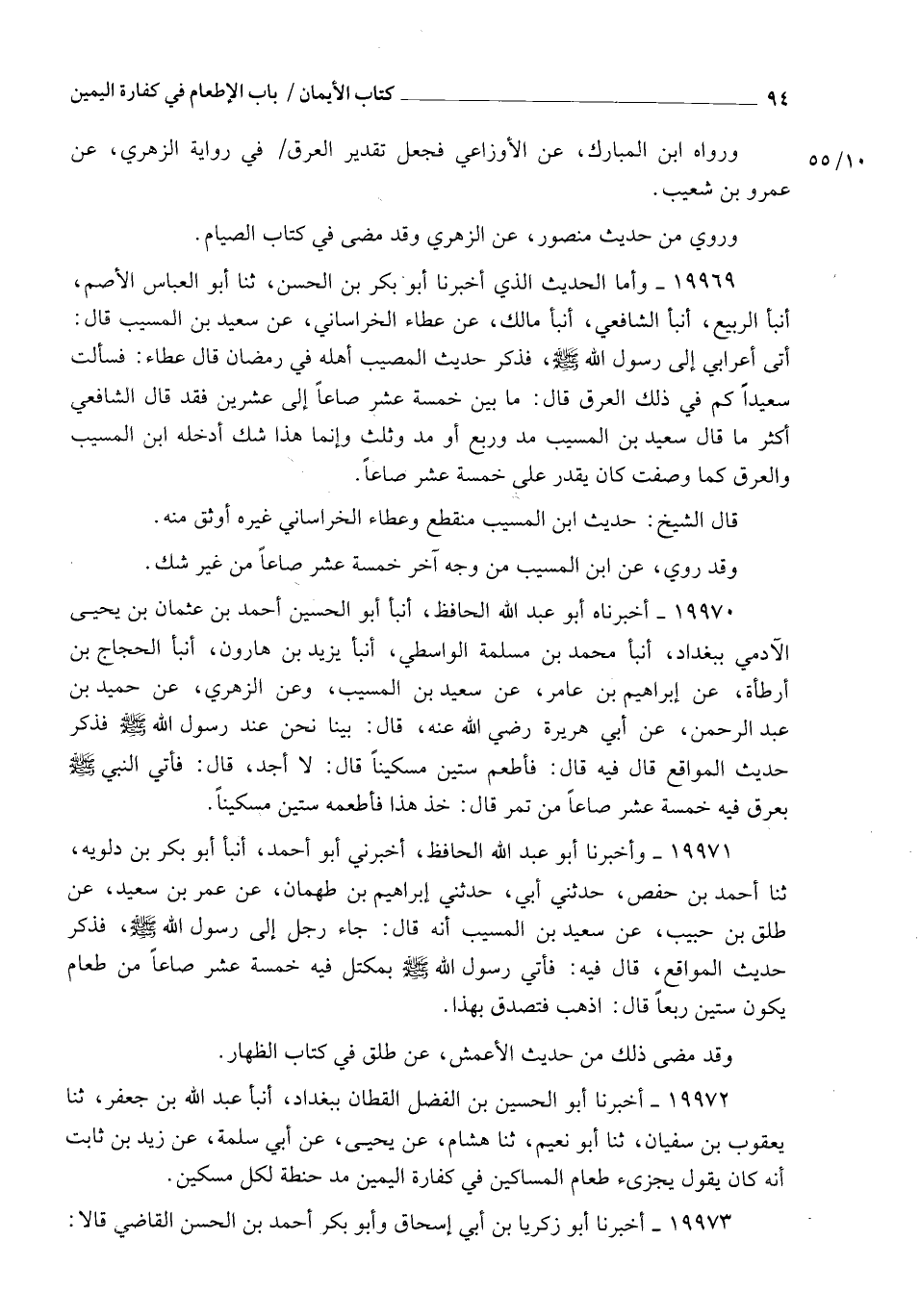 19970 - أَخْبَرَنَاهُ أَبُو عَبْدِ اللهِ الْحَافِظُ , أنبأ أَبُو الْحُسَيْنِ أَحْمَدُ بْنُ عُثْمَانَ بْنِ يَحْيَى الْآدَمِيُّ بِبَغْدَادَ أنبأ مُحَمَّدُ بْنُ مَسْلَمَةَ الْوَاسِطِيُّ , أنبأ يَزِيدُ بْنُ هَارُونَ , أنبأ الْحَجَّاجُ بْنُ أَرْطَاةَ , عَنْ إِبْرَاهِيمَ بْنِ عَامِرٍ , عَنْ سَعِيدِ بْنِ الْمُسَيِّبِ , وَعَنِ الزُّهْرِيِّ , عَنْ حُمَيْدِ بْنِ عَبْدِ الرَّحْمَنِ , عَنْ أَبِي هُرَيْرَةَ رَضِيَ اللهُ عَنْهُ قَالَ: §بَيْنَا نَحْنُ عِنْدَ رَسُولِ اللهِ صَلَّى اللهُ عَلَيْهِ وَسَلَّمَ , فَذَكَرَ حَدِيثَ الْمُوَاقِعِ , قَالَ فِيهِ: قَالَ: " فَأَطْعِمْ سِتِّينَ مِسْكِينًا " , قَالَ: " لَا أَجِدُ " , قَالَ: فَأُتِيَ النَّبِيُّ صَلَّى اللهُ عَلَيْهِ وَسَلَّمَ بِعِرْقٍ فِيهِ خَمْسَةَ عَشَرَ صَاعًا مِنْ تَمْرٍ , قَالَ: " خُذْ هَذَا , فَأَطْعِمْهُ سِتِّينَ مِسْكِينًا ".