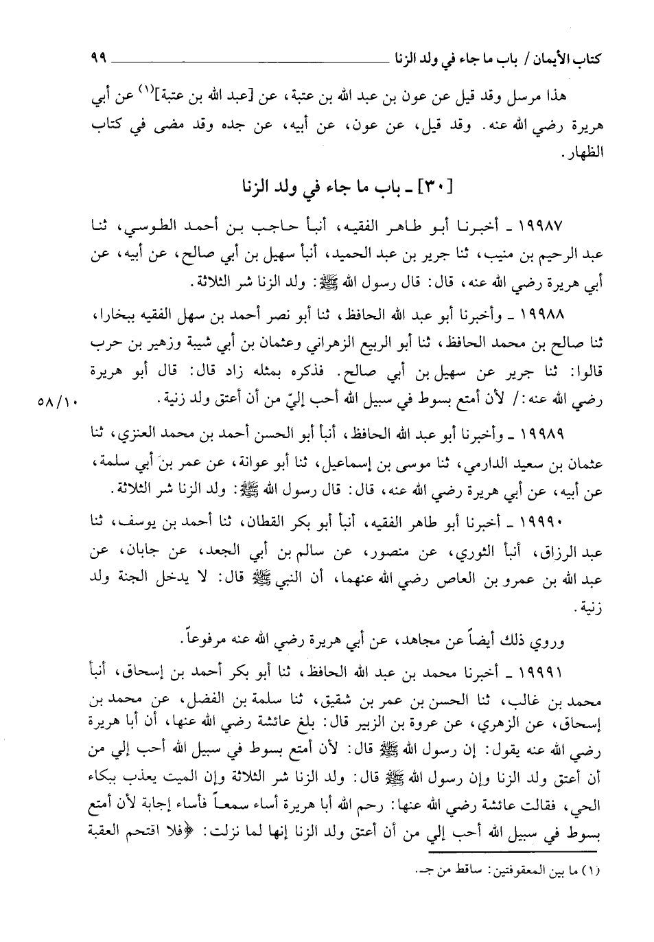 19987 - أَخْبَرَنَا أَبُو طَاهِرٍ الْفَقِيهُ , أنبأ حَاجِبُ بْنُ أَحْمَدَ الطُّوسِيُّ , ثنا عَبْدُ الرَّحِيمِ بْنُ مُنِيبٍ , ثنا جَرِيرُ بْنُ عَبْدِ الْحَمِيدِ , أنبأ سُهَيْلُ بْنُ أَبِي صَالِحٍ , عَنْ أَبِيهِ , عَنْ أَبِي هُرَيْرَةَ رَضِيَ اللهُ عَنْهُ قَالَ: قَالَ رَسُولُ اللهِ صَلَّى اللهُ عَلَيْهِ وَسَلَّمَ: §" وَلَدُ الزِّنَا شَرُّ الثَّلَاثَةِ ".