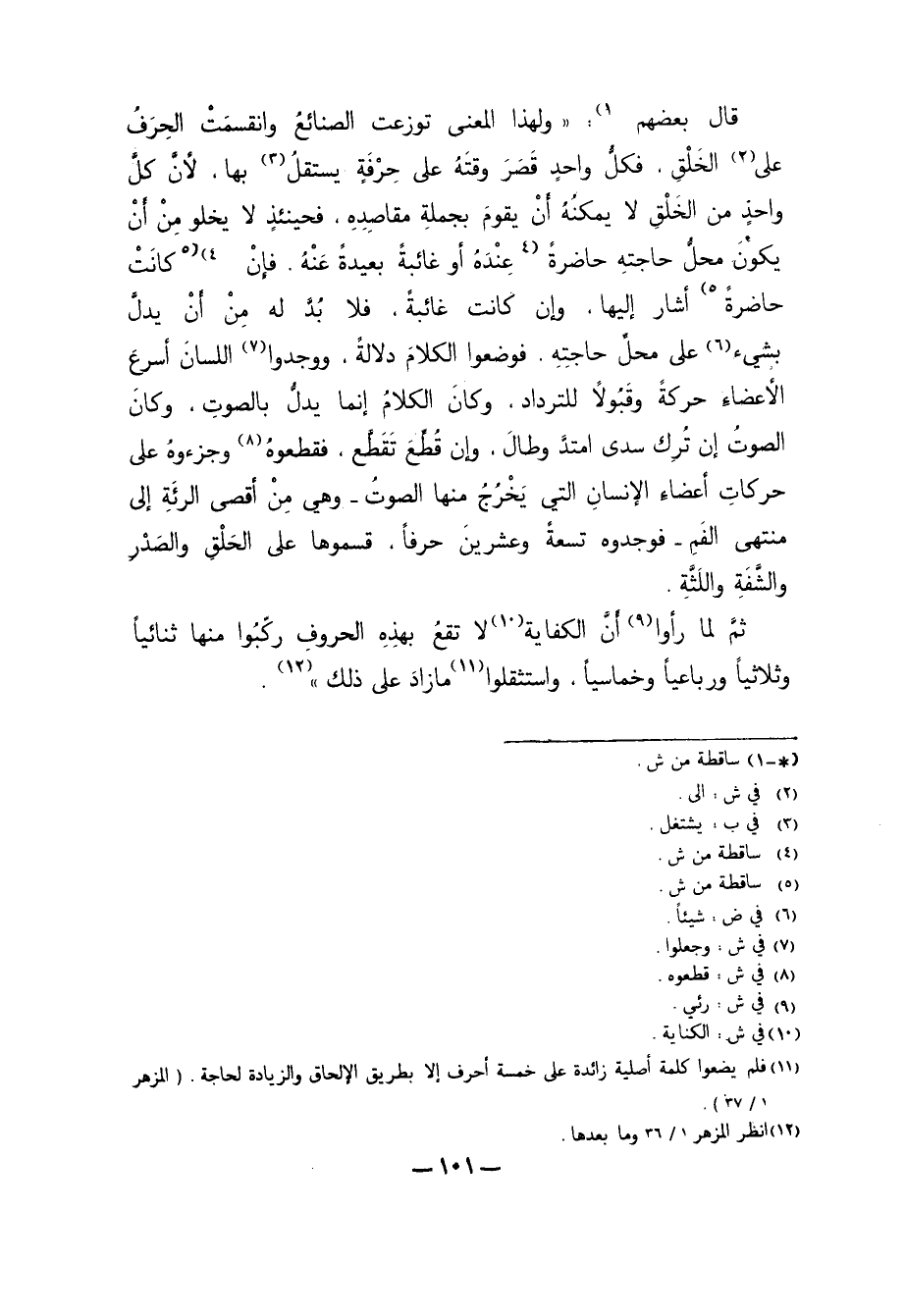 11 فلم يضعوا كلمة أصلية زائدة على خمس أحرف إلا بطريق الإلحاق والزيادة لحاجة. "المزهر 1/ 37".