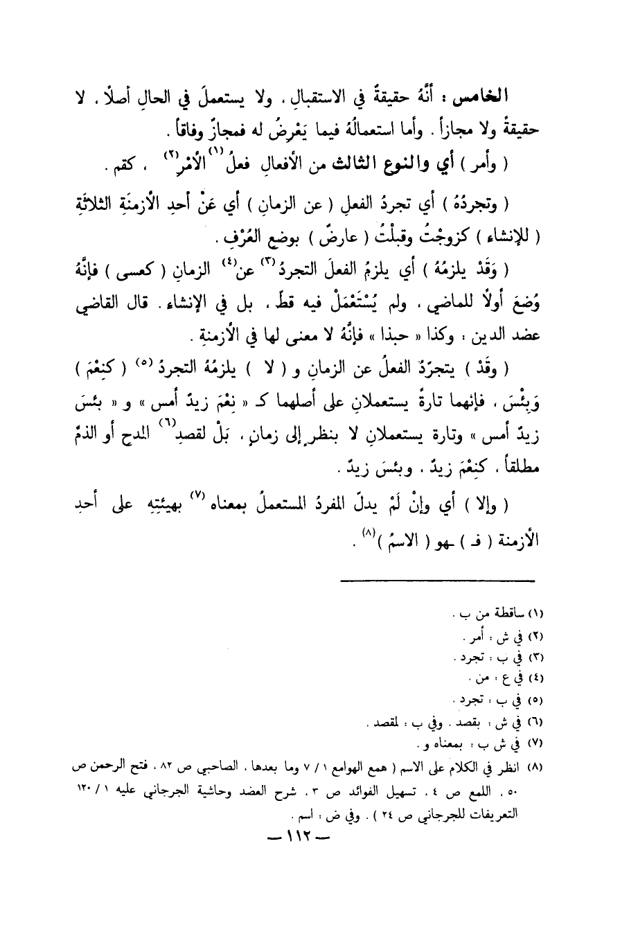 "وَقَدْ يَلْزَمُهُ" أَيْ يَلْزَمُ الْفِعْلَ التَّجَرُّدُ3 عَنْ4 الزَّمَانِ "كَعَسَى" فَإِنَّهُ وُضِعَ أَوَّلاً لِلْمَاضِي، وَلَمْ يُسْتَعْمَلْ فِيهِ قَطُّ، بَلْ فِي الإِنْشَاءِ. قَالَ الْقَاضِي عَضُدُ الدِّينِ: وَكَذَا "حَبَّذَا" فَإِنَّهُ لا مَعْنَى لَهَا فِي الأَزْمِنَةِ.