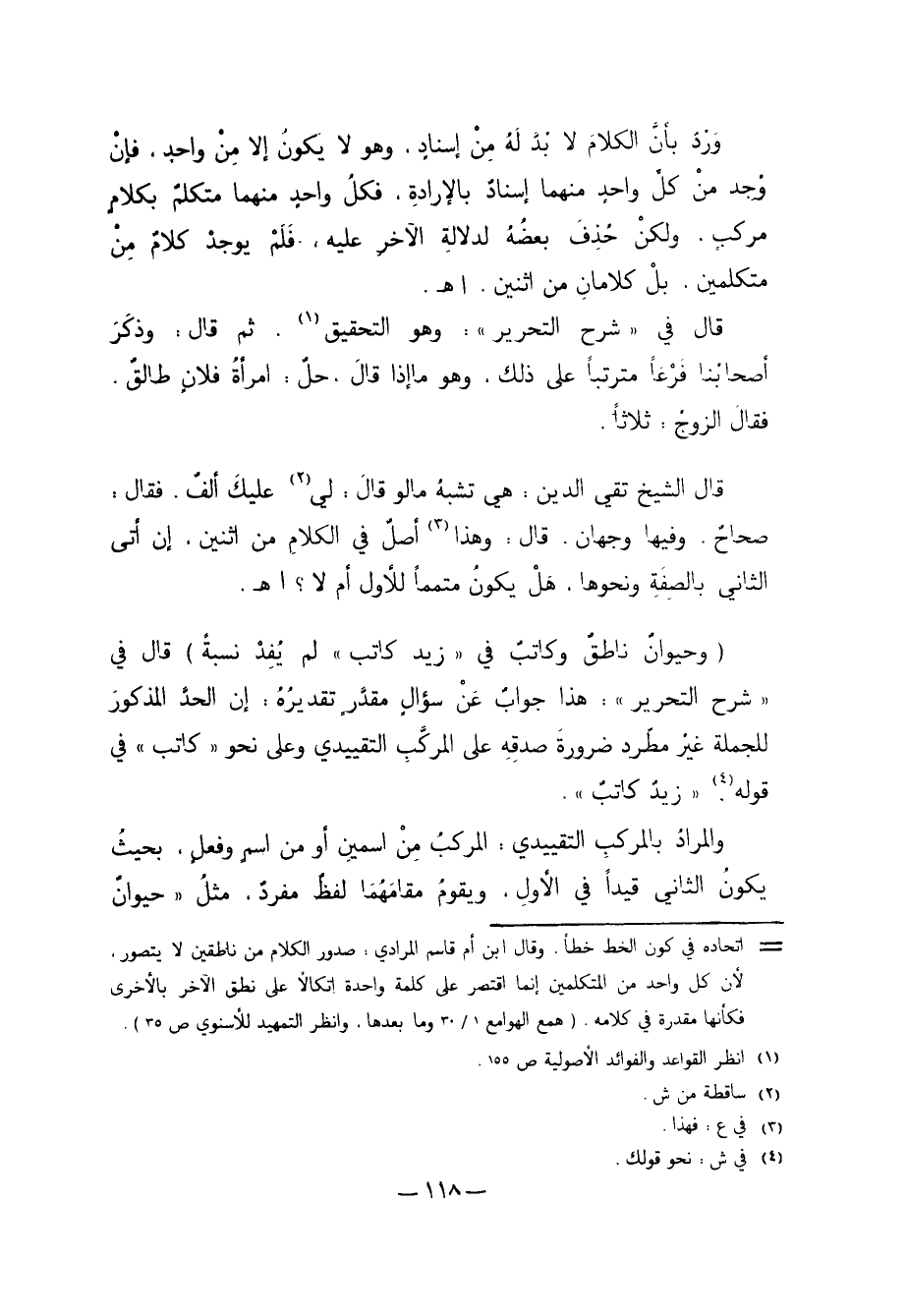"وَحَيَوَانٌ نَاطِقٌ، وَكَاتِبٌ، فِي "زَيْدٌ كَاتِبٌ"، لَمْ يُفِدْ نِسْبَةً" قَالَ فِي "شَرْحِ التَّحْرِيرِ": هَذَا جَوَابٌ عَنْ سُؤَالٍ مُقَدَّرٍ، تَقْدِيرُهُ: أَنَّ الْحَدَّ الْمَذْكُورَ لِلْجُمْلَةِ غَيْرُ مُطَّرِدٍ ضَرُورَةَ صِدْقِهِ عَلَى الْمُرَكَّبِ التَّقْيِيدِيِّ، وَعَلَى نَحْوِ "كَاتِبٌ" فِي قَوْلِه4: "زَيْدٌ كَاتِبٌ".