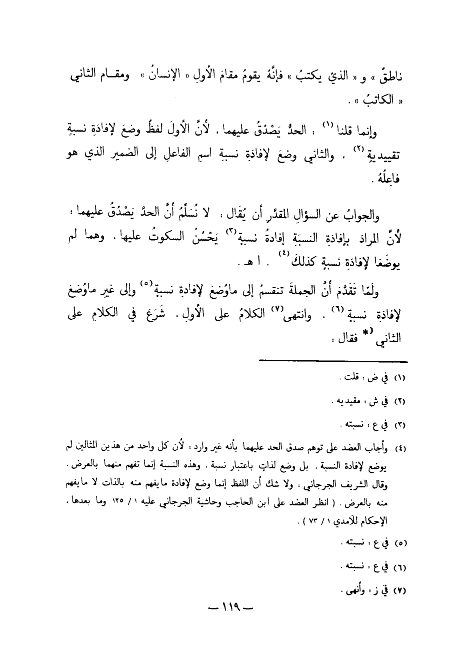 نَاطِقٌ"، وَ "اَلَّذِي يَكْتُبُ". فَإِنَّهُ يَقُومُ مَقَامَ الأَوَّلِ: "الإِنْسَانُ"، وَمَقَامَ الثَّانِي: "الْكَاتِبُ".