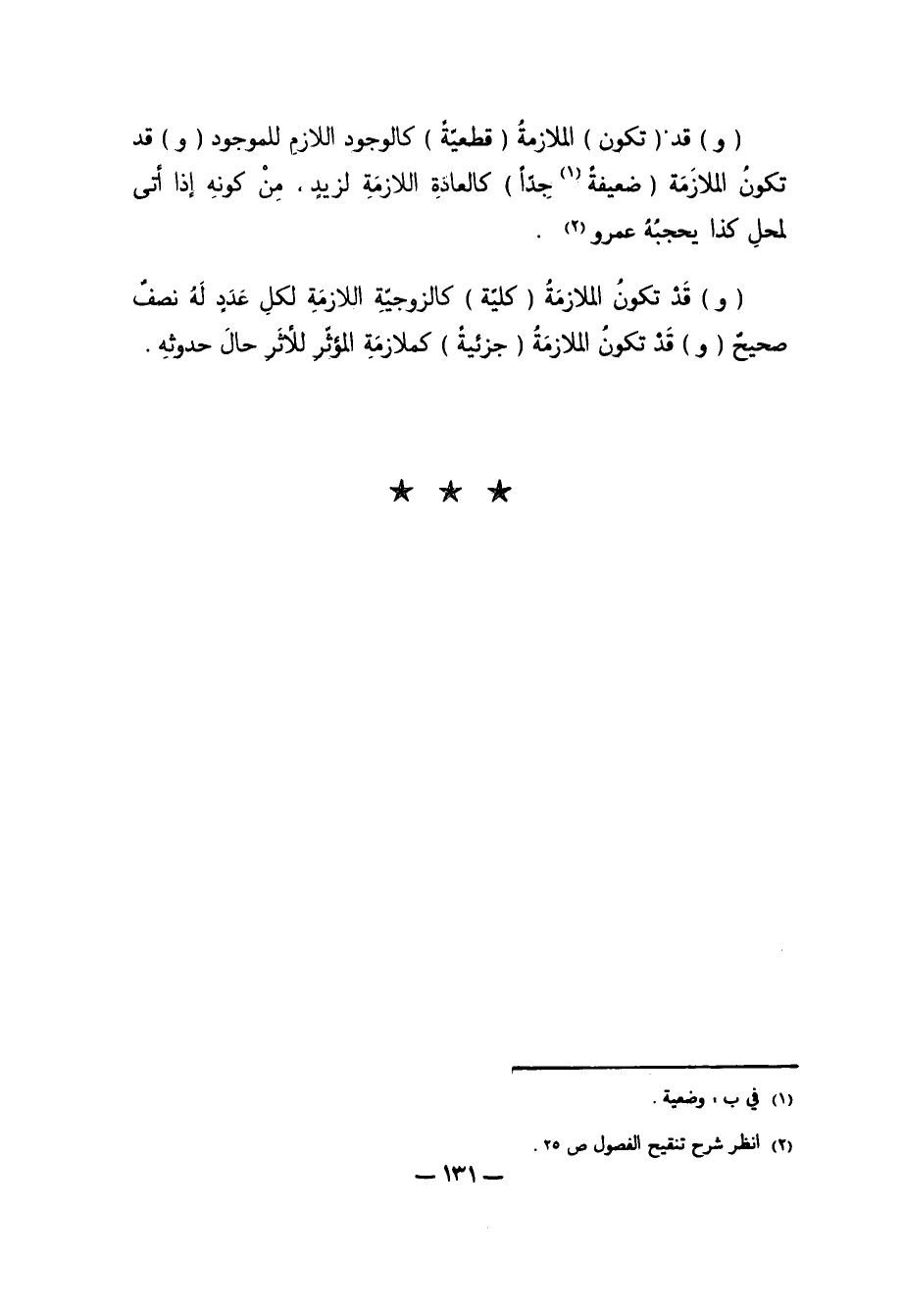 "وَ" قَدْ "تَكُونُ" الْمُلازَمَةُ "قَطْعِيَّةً" كَالْوُجُودِ اللاَّزِمِ لِلْمَوْجُودِ "وَ" قَدْ تَكُونُ الْمُلازَمَةُ "ضَعِيفَةً1 جِدًّا" كَالْعَادَةِ اللاَّزِمَةِ لِزَيْدٍ، مِنْ كَوْنِهِ إذَا أَتَى لِمَحَلِّ كَذَا يَحْجُبُهُ عَمْرٌو2.