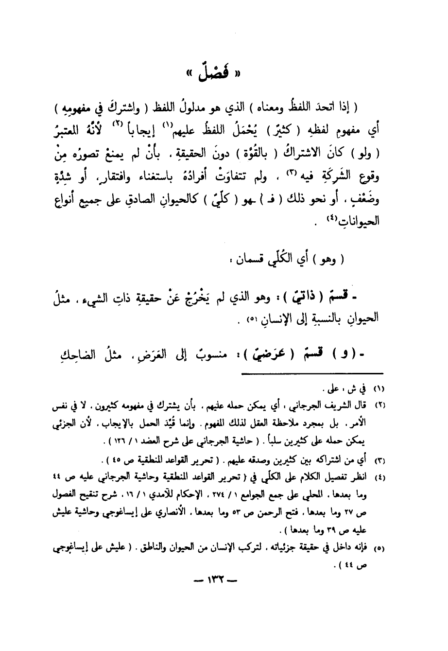 4 انظر تفصيل الكلام على على الكلي في "تحرير القواع المنطقية وحاشية الجرجاني عليه ص44 وما بعدها, المحلي على جمع الجوامع1/274, الإحكام للآمدي 1/16, شرح تنقيح الفصول ص27 وما بعدها، فتح الرحمن ص53 وما بعدها، الأنصاري على إيساغوجي وحاشية عليش عليه ص39 وما بعدها".
