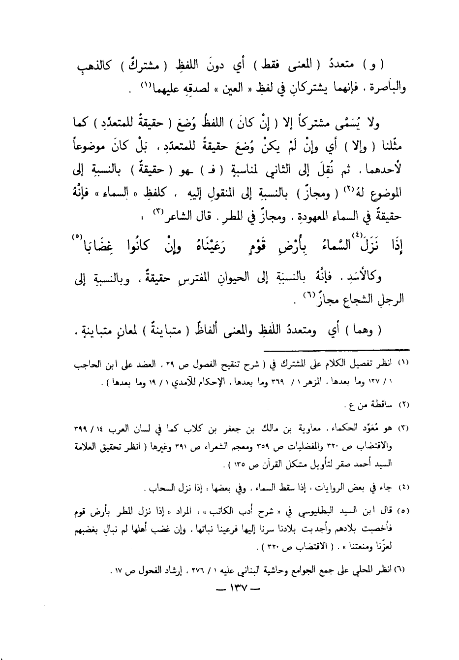 1 انظر تفصيل الكلام على المشترك في "شرح تنقيح الفصول ص29، العضد على ابن لحاجب 1/ 127 وما بعدها، المزهر 1/ 369 وما بعدها، الإحكام للآمدي 1/ 19 وما بعدها".