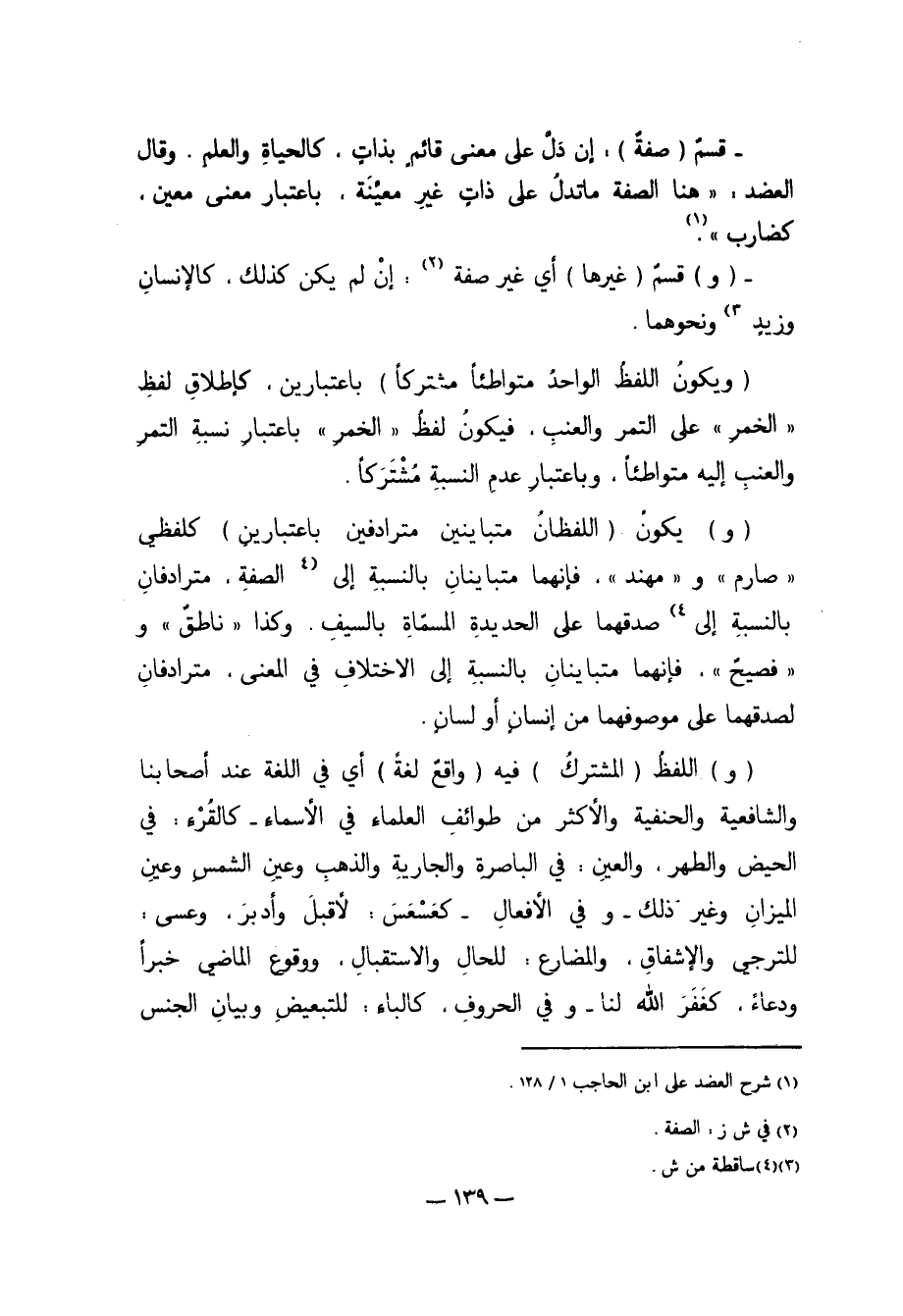 - قِسْمٌ "صِفَةٌ": إنْ دَلَّ عَلَى مَعْنًى قَائِمٍ بِذَاتٍ كَالْحَيَاةِ وَالْعِلْمِ وَقَالَ الْعَضُدُ: "هُنَا الصِّفَةُ مَا تَدُلُّ عَلَى ذَاتٍ غَيْرِ مُعَيَّنَةٍ بِاعْتِبَارِ مَعْنًى مُعَيَّنٍ كَضَارِبٍ"1.