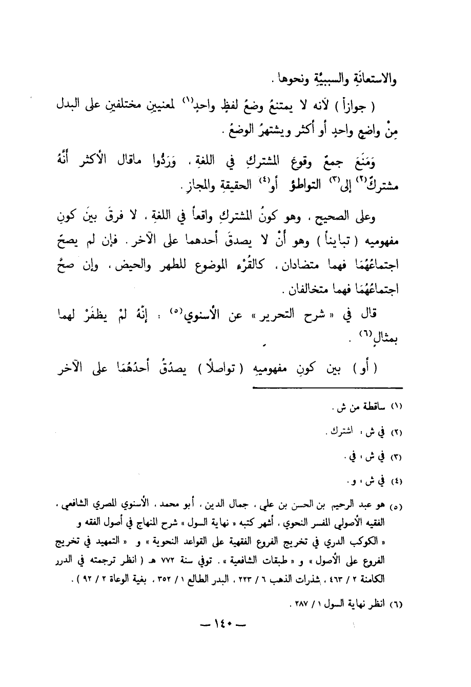 5 هو عبد الرحيم بن الحسن بن علي، جمال الدين، أبو محمد، الأسنوي المصري الشافعي، الفقيه الأصولي المفسر النحوي، أشهر كبته "نهاية السول" شرح المنهاج في أصول الفقه و "الكوكب الدري في تخريج الفروع الفقهية على القواعد النحوية" و "التمهيد في تخريج الفروع على الأصول" و "طبقات الشافعية". توفي سنة 772هـ. "انظر ترجمته في الدرر الكامنة 2/ 463، شذرات الذهب 6/ 223، البدر الطالع 1/ 352، بغية الوعاة 2/ 92".