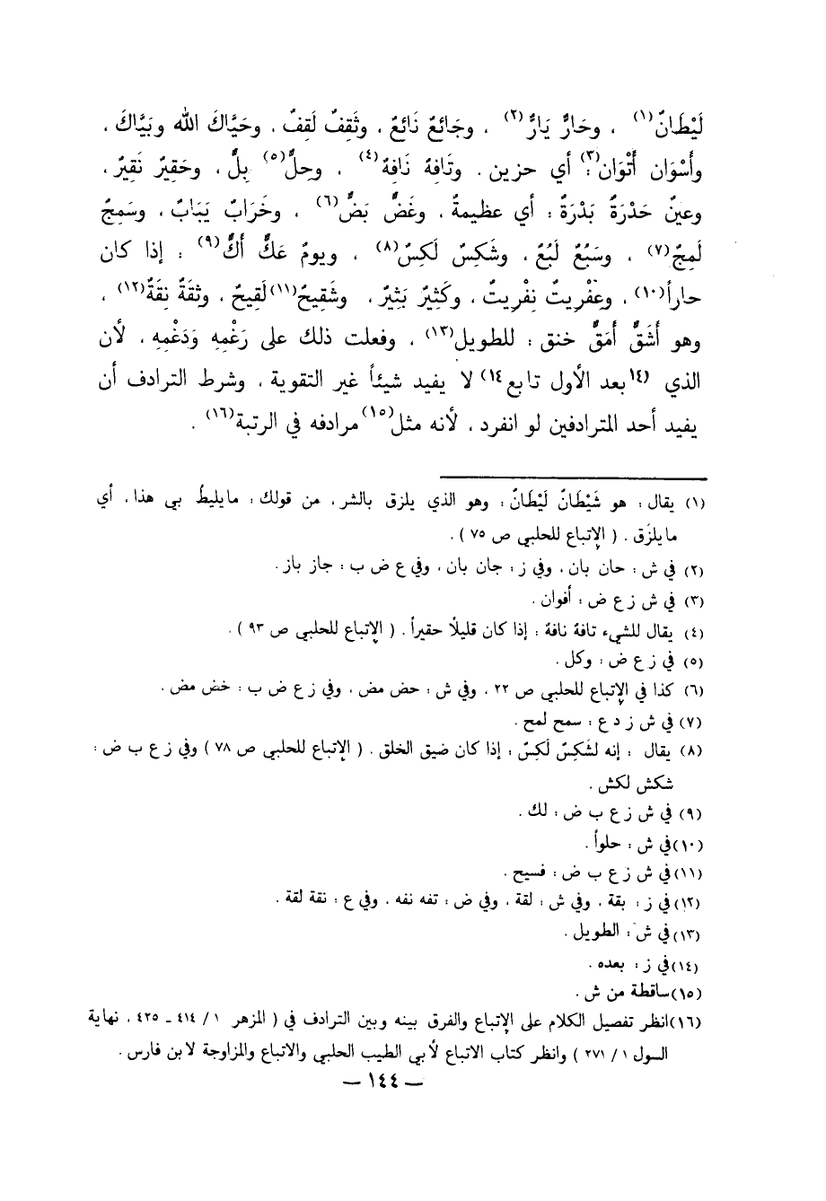 16 انظر تفصل الكلام على الإتباع والفرق بينه وبين الترادف في "المزهر 1/414-425, نهاية السول 1/ 271" وانظركتاب الاتباع لأبي الطيب الحلبي والاتباع والمزاوجة لابن فارس.